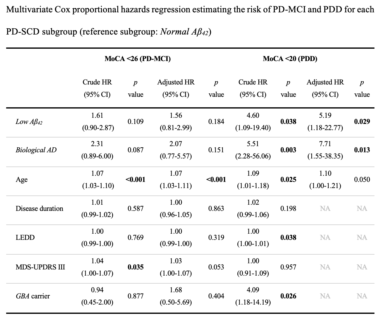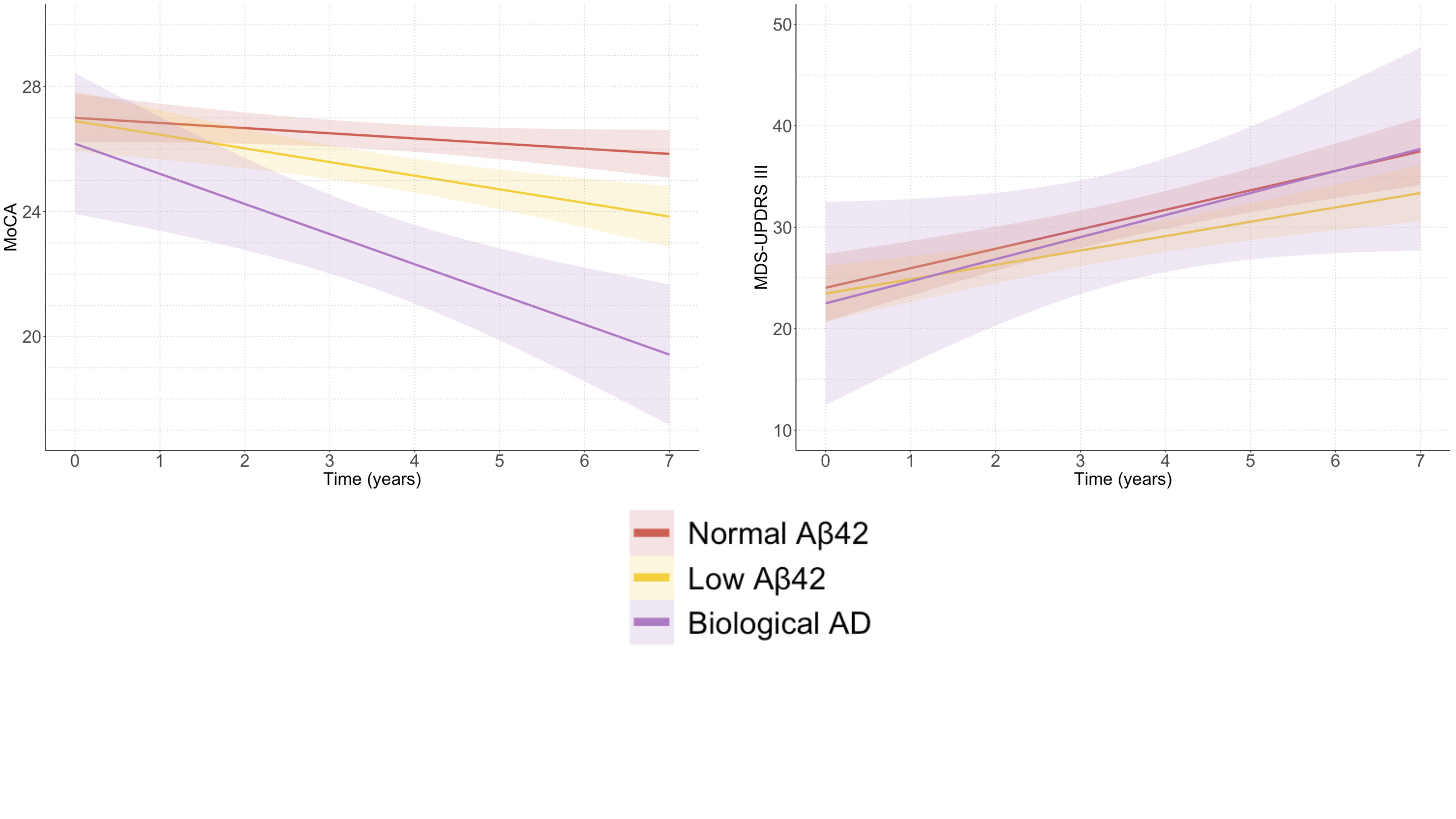 Results: We included a total of 80 patients. At baseline, the mean age was 62.1 years and the median disease duration was 5.6 months. Among the five patients with biological AD (as per CSF biomarkers), MoCA scores showed a greater decline compared to patients without biological AD (year 7: β=-4.15, p=0.009). After excluding AD patients from the analysis, LMEMs still demonstrated an association between baseline log-transformed Aβ42 and MoCA progression (β=2, p=0.004). Based on these findings, we categorized patients into three CSF-based subgroups: Normal Aβ42 (n=50), Low Aβ42 (n=25), and Biological AD (n=5). LMEMs predicted faster cognitive decline for Low Aβ42 vs Normal Aβ42 (β=-0.161 points-per-year, p=0.007), and for Biological AD vs Normal Aβ42 (β=-0.390 points-per-year, p<0.001) (Figure). Additionally, the risk of developing dementia was higher in the Low Aβ42 (HR=5.2, p=0.029) and the Biological AD subgroups (HR=7.7, p=0.013) (Table).