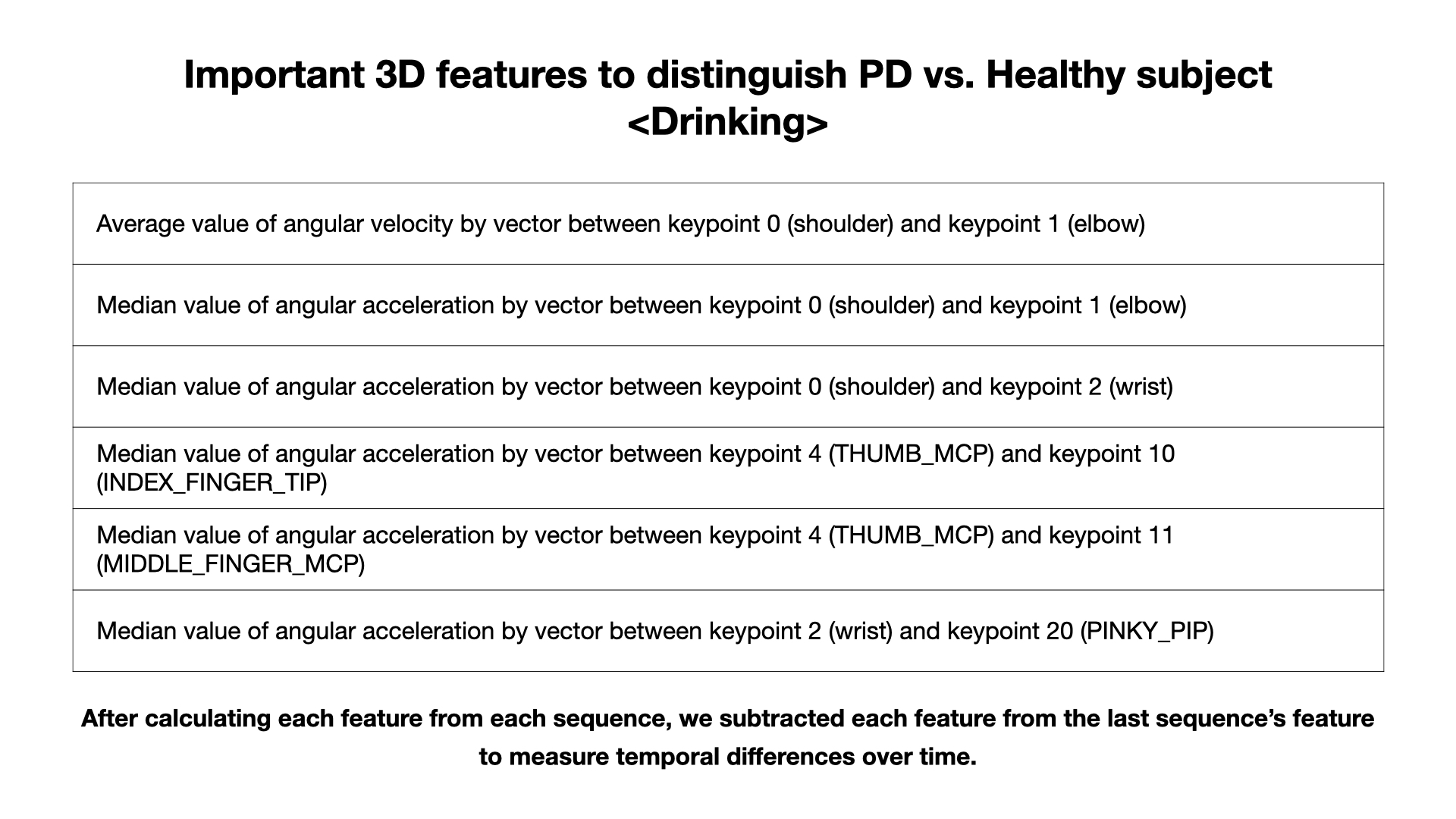 Conclusion: Our paper proposed the explainable ML model for PD patient’s ADL analysis. 3D poses were used to quantify movements, and our work suggested a potential way to detect PD using daily activities.