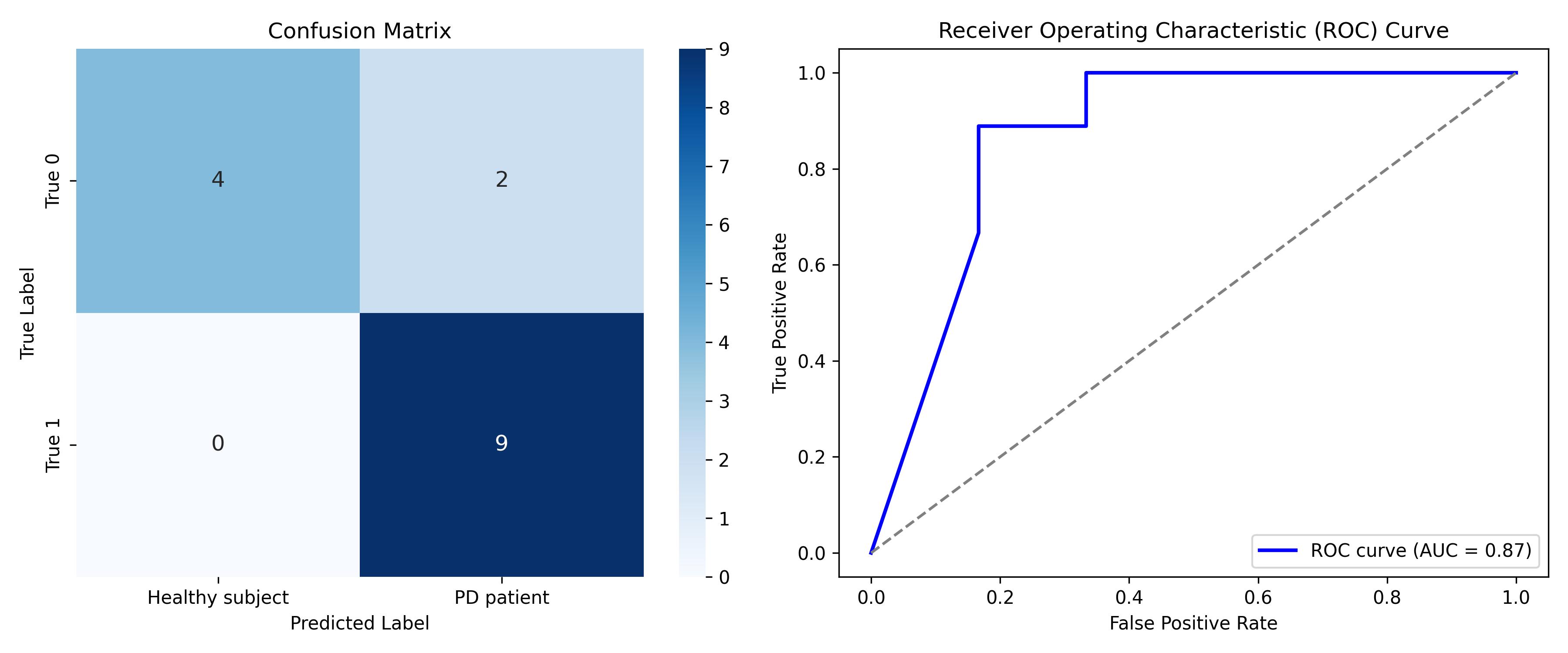 Results: We found six statistical important features as shown in Figure 2 and Figure 3. Using these features, our model performed 86.7% of classification accuracy in 15 subjects and 83% in the external validation. (F1 score=0.9, AUC=0.87 (Figure 4))