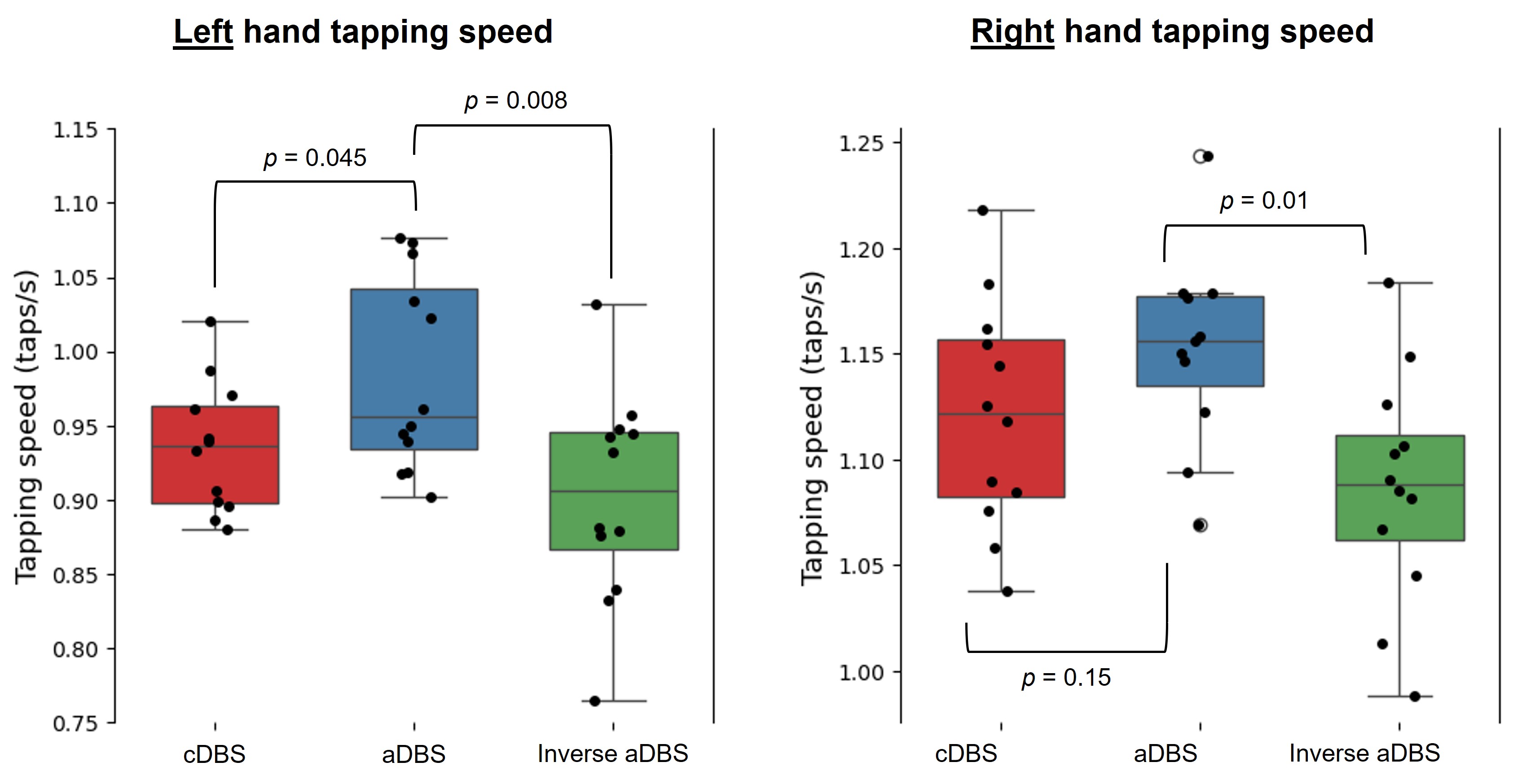 Method: We implanted bilateral Medtronic RC+S neurostimulators and electrocorticography arrays in a patient with PD. Recordings were made from the subthalamic nucleus and sensorimotor cortex while forearm speeds were monitored using wrist-worn accelerometers. We developed and validated an aDBS policy that increased stimulation during forearm movement, both in a short, supervised tapping task and over an 18-day period in an unconstrained, naturalistic setting. The study included two control conditions to which the patient was blinded: cDBS and an inverse aDBS policy where stimulation levels were lowered during movement.