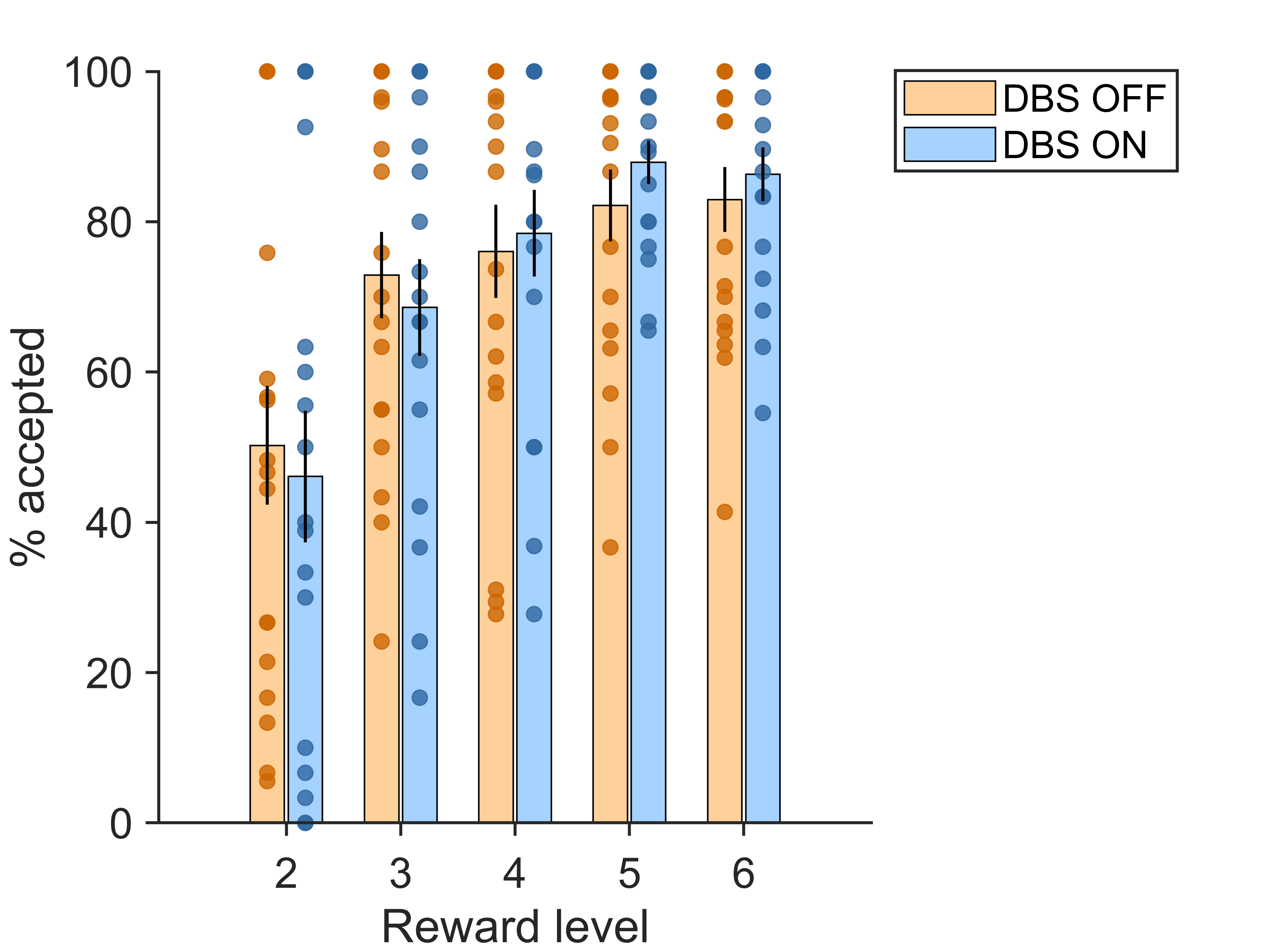 Conclusion: PwPD off DBS exhibit typical behavior, accepting more trials as reward increases. When DBS is on, it enhances the likelihood of accepting high reward trials. These findings further our understanding of how DBS affects reward evaluation and highlight the need to elucidate the neural mechanisms of these effects.