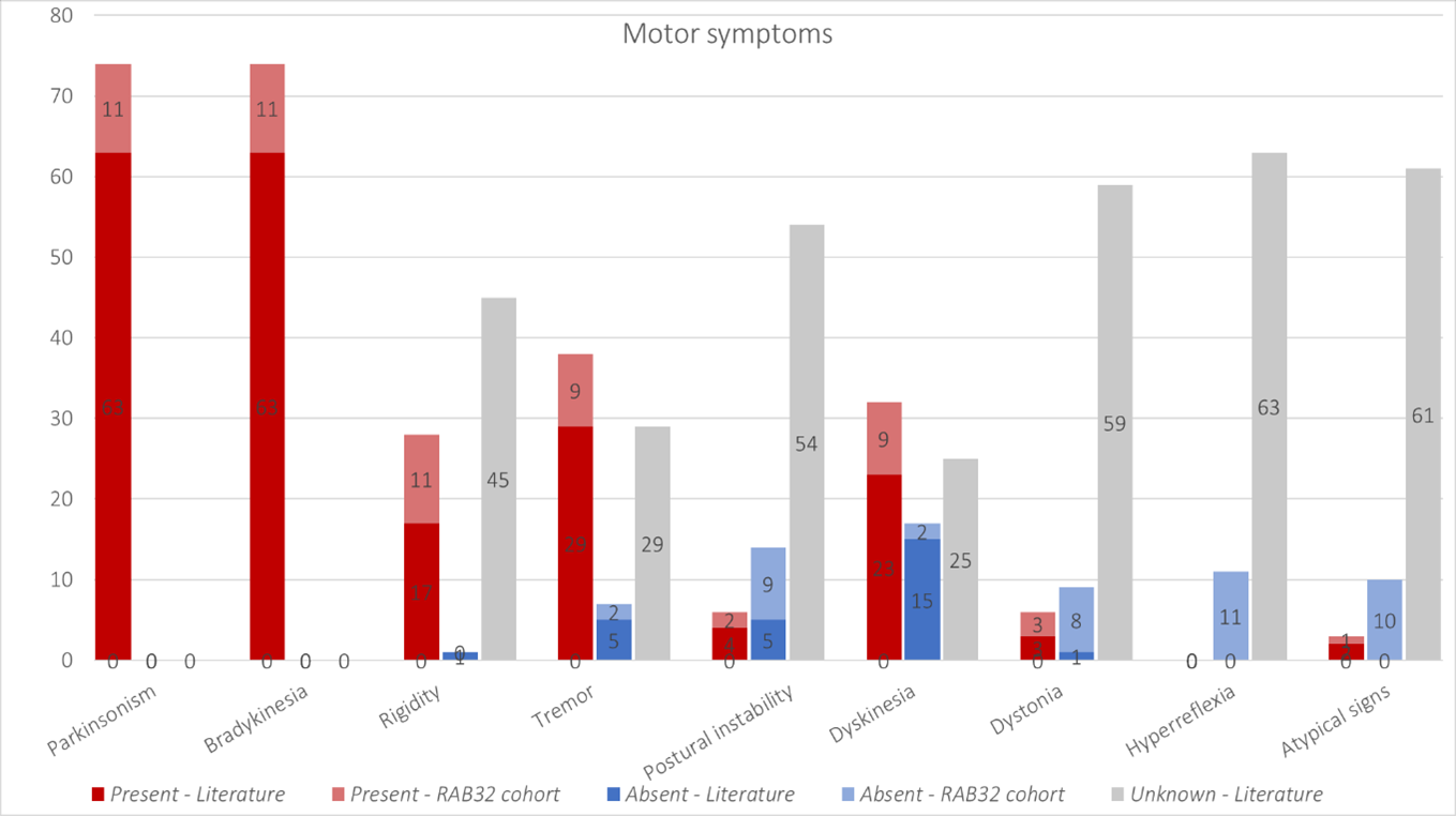 Results: Clinical data was compiled from 74 patients with PARK-RAB32, 11 of whom underwent deep phenotyping (RAB32 cohort). The other 63 were published in 5 publications to date[1, 2, 5–7]. The median age at onset was 54 years (IQR 14), 55.4% were female, and in 64.8% of the patients, a positive family history was reported, suggesting reduced penetrance of this variant, as also confirmed in 8/10 families from the RAB32 cohort.