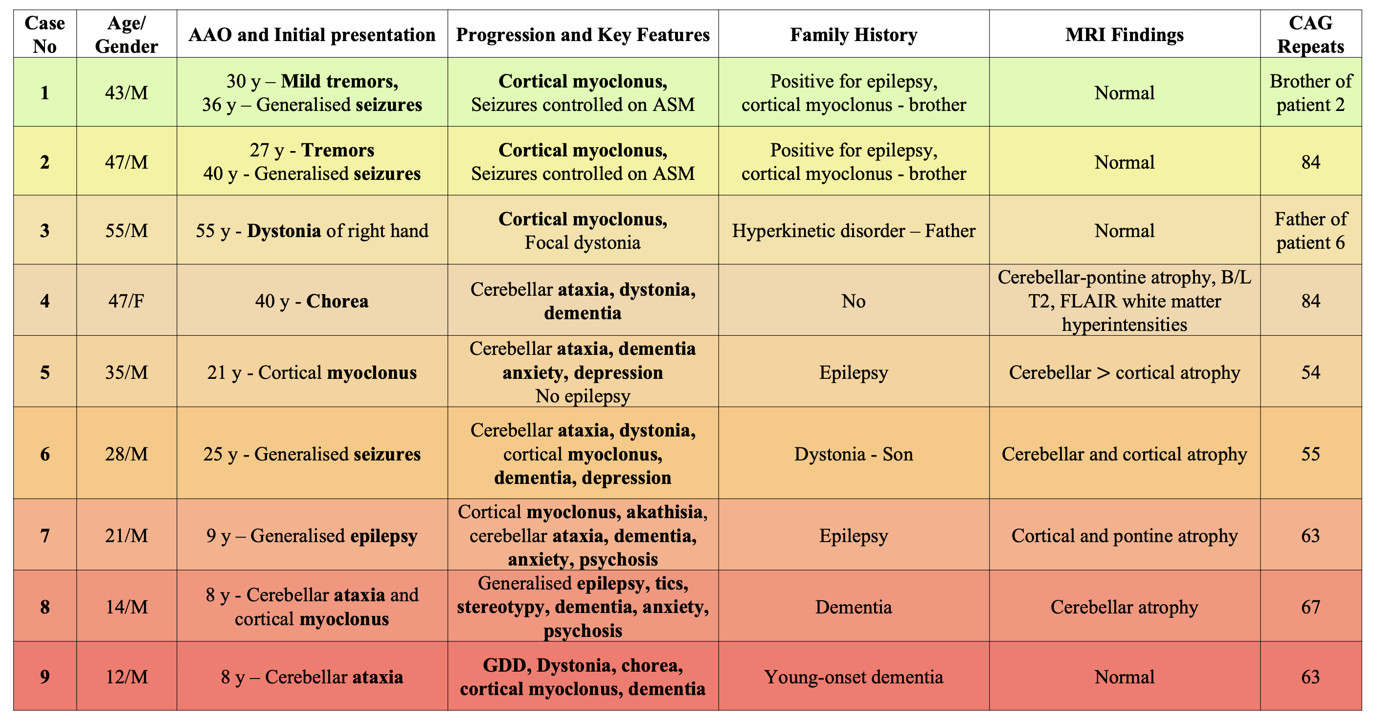 Results: The case series includes 8 male and 1 female patients. Their age of onset ranged from 8 to 55 years. 3 paediatric-onset cases (Cases 5, 6, 7) presented with, cortical myoclonus, generalised epilepsy and ataxia respectively. 5 adult-onset cases had varied presentation such as tremors, dystonia, cerebellar ataxia, cortical myoclonus or epilepsy which was well-controlled on anti-seizure medications. Cortical myoclonus and dementia were the most common findings, present in 6 patients, followed by epilepsy, which was present in 5 patients. 8 out of 9 patients had a positive family history of a hyperkinetic movement disorder, epilepsy or dementia. MRI brain was normal in 4 patients, 4 patients had cerebellar, cortical or pontine atrophy and one patient had diffuse B/L T2, FLAIR white matter hyperintensities. 7 out of 9 patients had abnormally increased CAG repeats in either allele of the ATN1 gene, and remaining 2 patients had a first degree relative with genetically confirmed DRPLA.