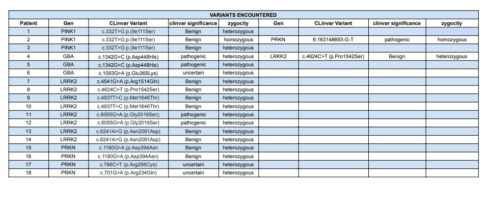 Results: Variants were detected in 18 individuals/46 (39.1%). Five out of 46 patients (5/46- 10.9%) had a pathogenic variant (ClinVar). Pathogenic LRRK2 variants were identified in 2/46 patients (4.4%), 2/46 patients (4.4%) had pathogenic GBA1 variants and 1 of 46 patients (2.2%) had a pathogenic PRKN variant.