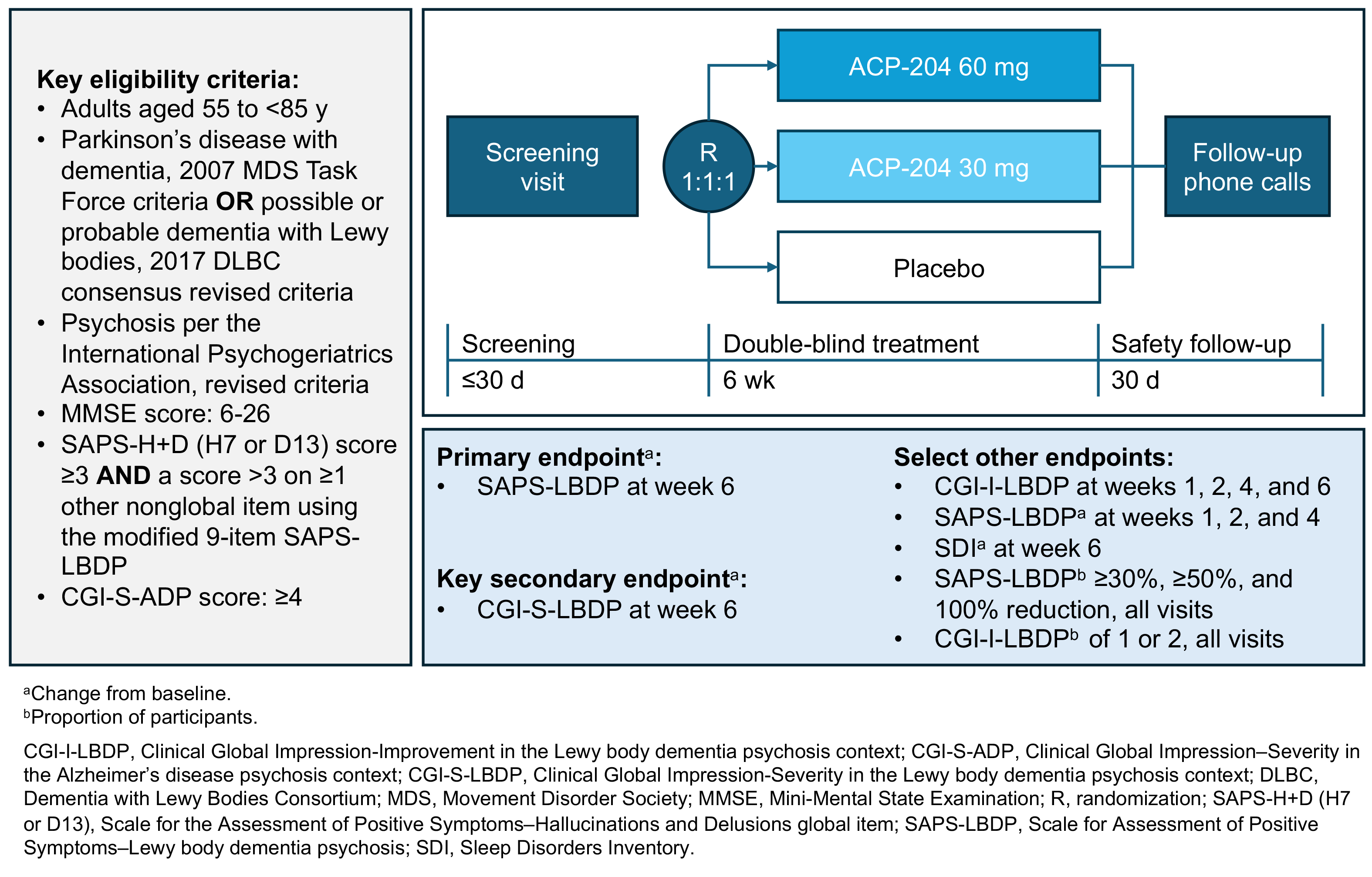 Method: This is a multicenter, randomized, double-blind, placebo-controlled phase 2 study investigating the efficacy, dose response, and safety of ACP-204 60 or 30 mg in LBDP. Eligible patients include adults with LBDP and psychosis persisting ≥2 months prior to screening. PDD/DLB will be confirmed using established clinical criteria; α-synuclein will be measured but not required for inclusion. Participants will be randomized 1:1:1 to receive placebo, ACP-204 30 mg, or 60 mg for 6 weeks, with a 50% cap on randomization of patients with PDDP on all treatment groups and no cap for patients with DLBP. Target enrollment is ~180 participants, allowing for ~10% nonevaluable participants, providing ≥85% power to detect an effect size of 0.6 between ACP-204 30 or 60 mg and placebo at α=0.05 using a 2-sided test. Participants will be stratified by disease and study site. Those who complete the double-blind treatment period may be eligible to enroll in the open-label extension (OLE). The study will include a ≤30-day screening period, a 6-week double-blind treatment period, a 30-day safety follow-up (excludes OLE participants), and a mortality follow-up for participants with early study termination (Figure). The primary endpoint will be change from baseline to week 6 in the Scale for Assessment of Positive Symptoms (SAPS) for LBDP (equivalent to the SAPS-PDP).