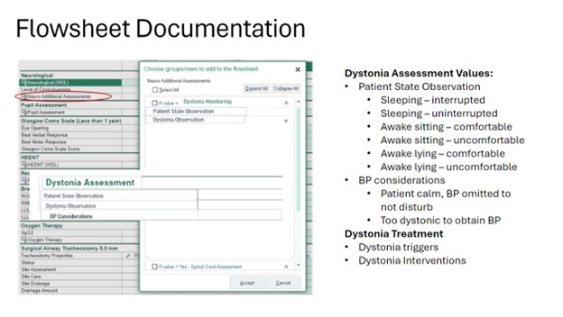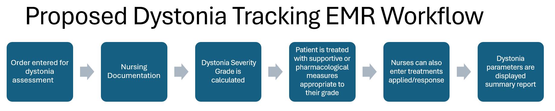 Method: A multidisciplinary team, including neurologists, nurses, and health informatics specialists, worked together to determine the best approach for tracking and displaying dystonia measures in the EMR (Epic © at our local hospital). We conducted focus groups with nurses and observed hospital wards where dystonia patients were frequently admitted. We came up with a proposed workflow for EMR dystonia tracking (Fig 1).