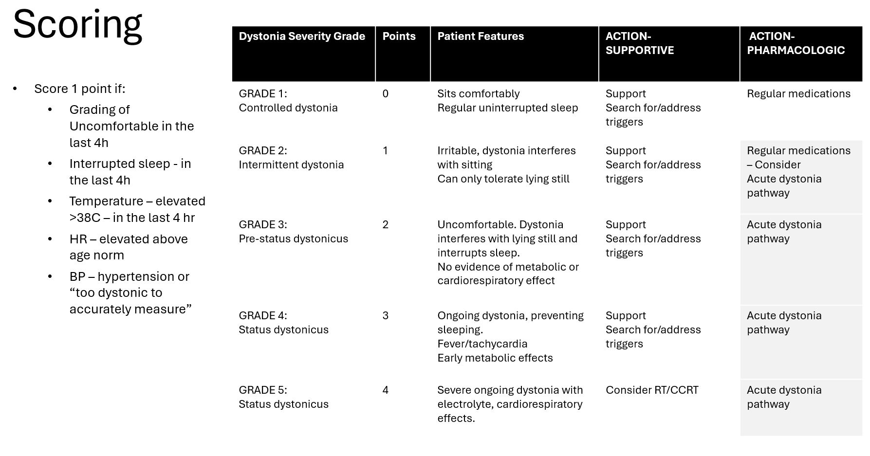 References: 1. Vogt LM, Yang K, Tse G, et al. Recommendations for the Management of Initial and Refractory Pediatric Status Dystonicus. Mov Disord. 2024;39(9):1435-1445. doi:10.1002/mds.29794