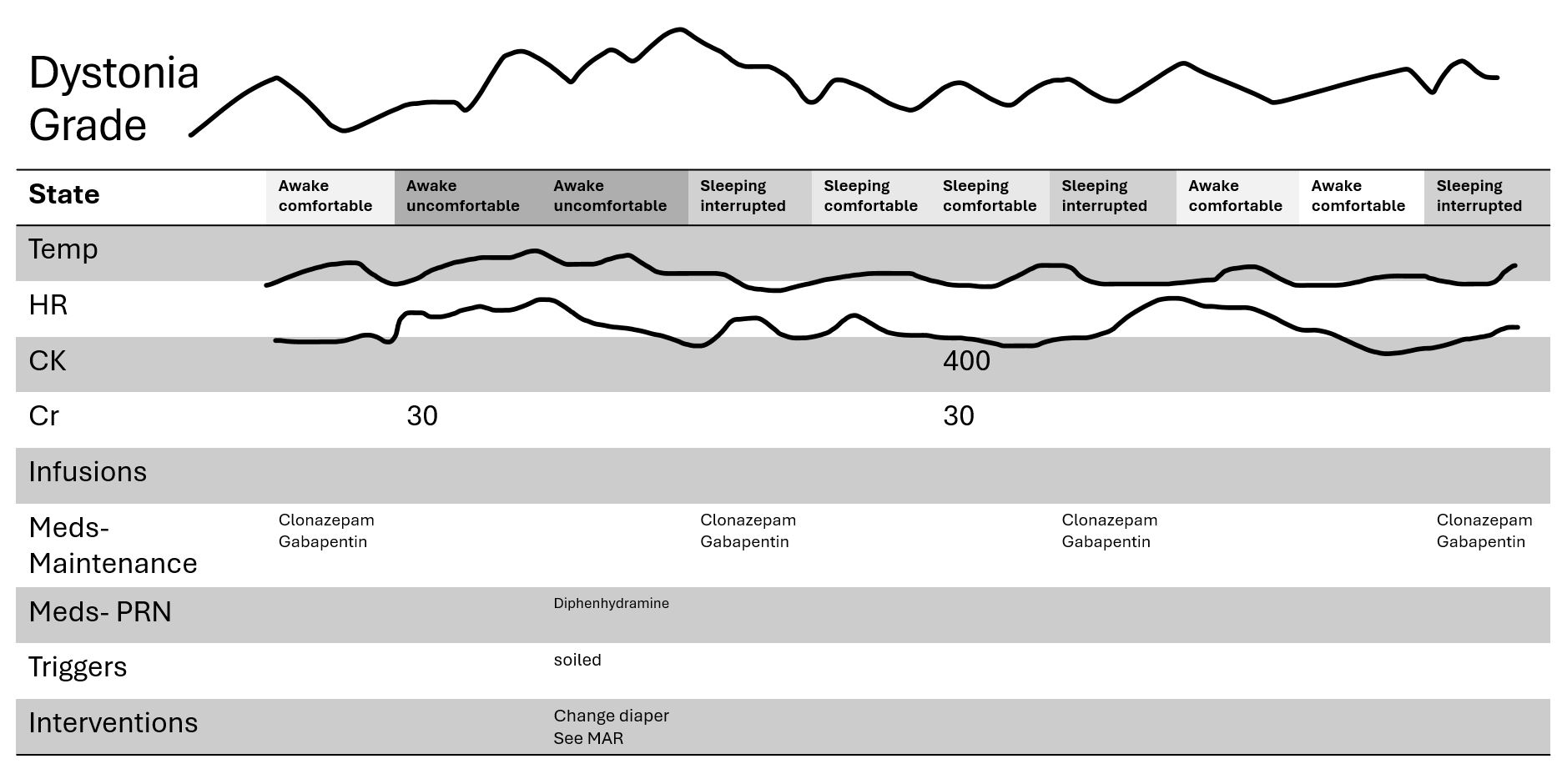 Background: Dystonia is common in children with medical complexity and neurological impairment, often worsening with pain, illness, and emotion. Severe dystonia, termed status dystonicus (SD), can be life-threatening and lead to complications such as respiratory distress, rhabdomyolysis, and severe pain. Early detection and monitoring are critical for timely treatment. Despite developing a recommendations and a hospital guideline for SD management,1 based on a previously proposed documentation,2 we found that clinicians faced challenges in monitoring dystonia severity and identifying when to intervene. To improve care, we collaborated with bedside nurses and the clinical informatics team to create an electronic monitoring tool for dystonia severity.