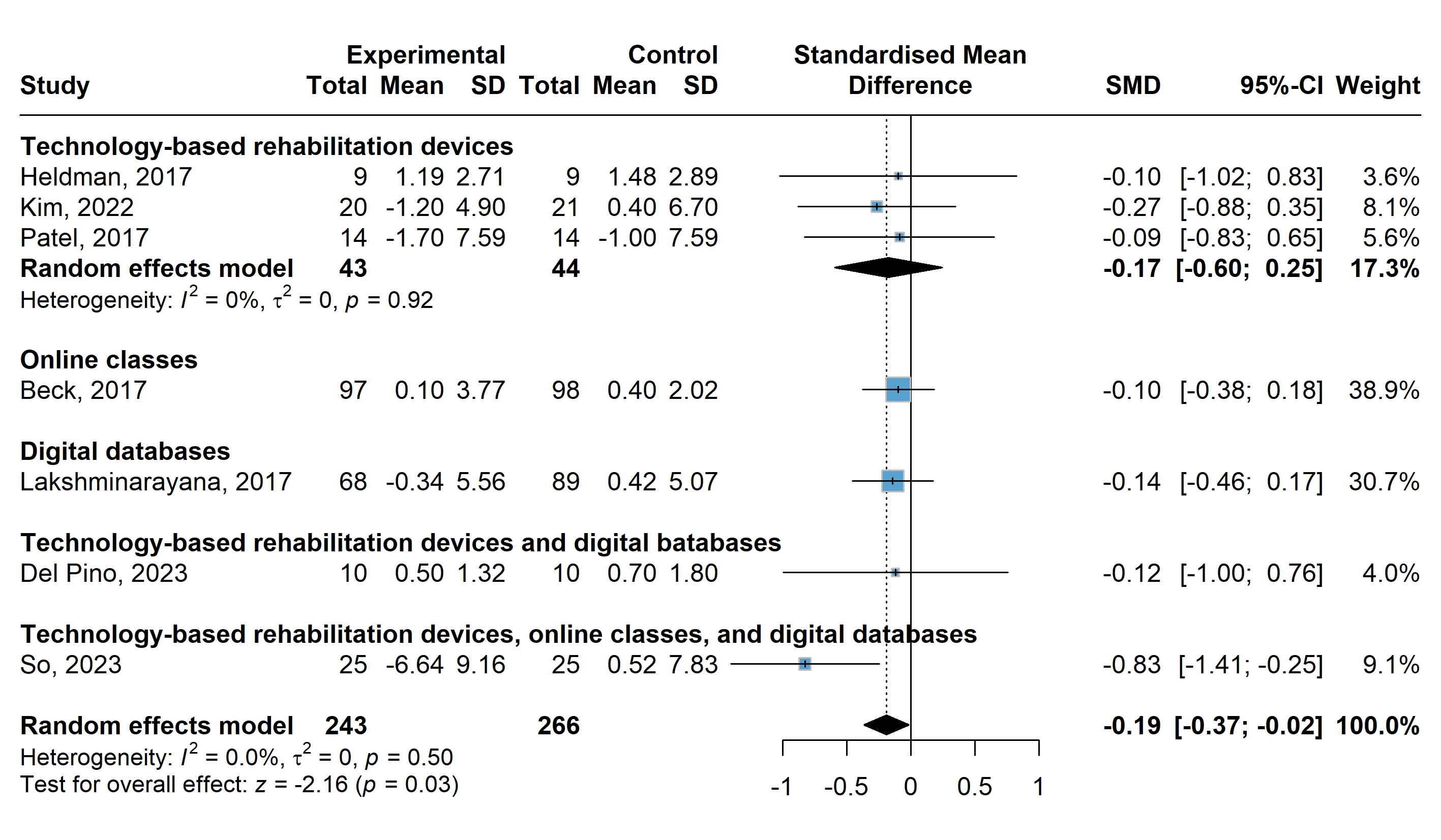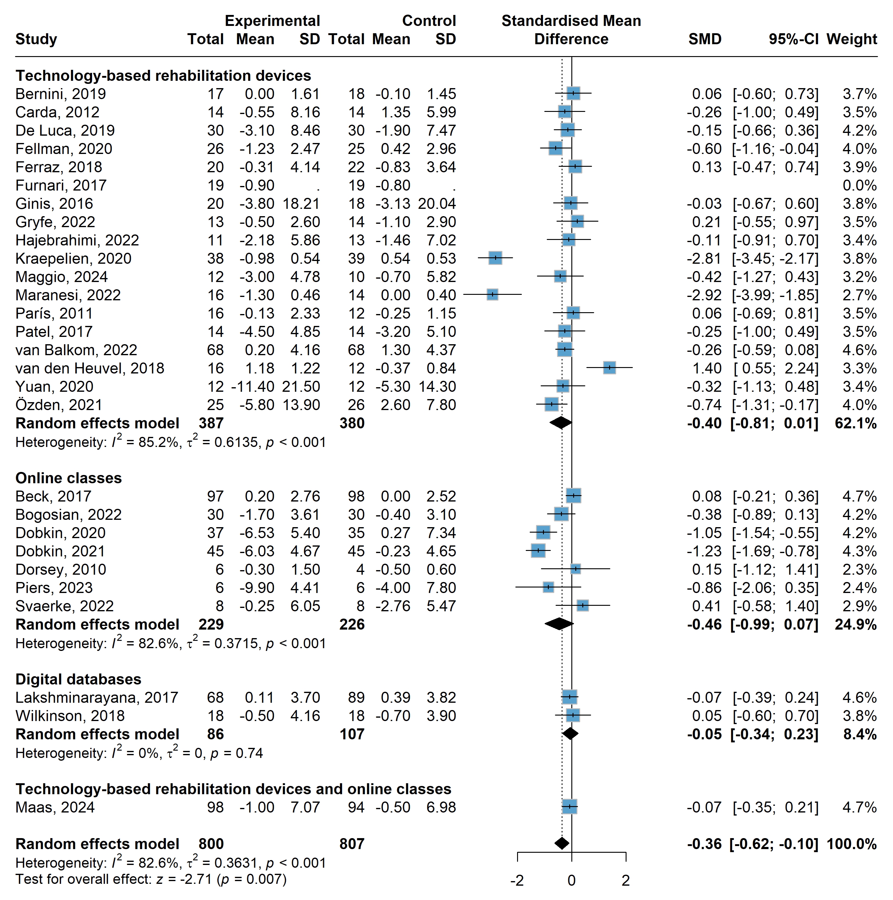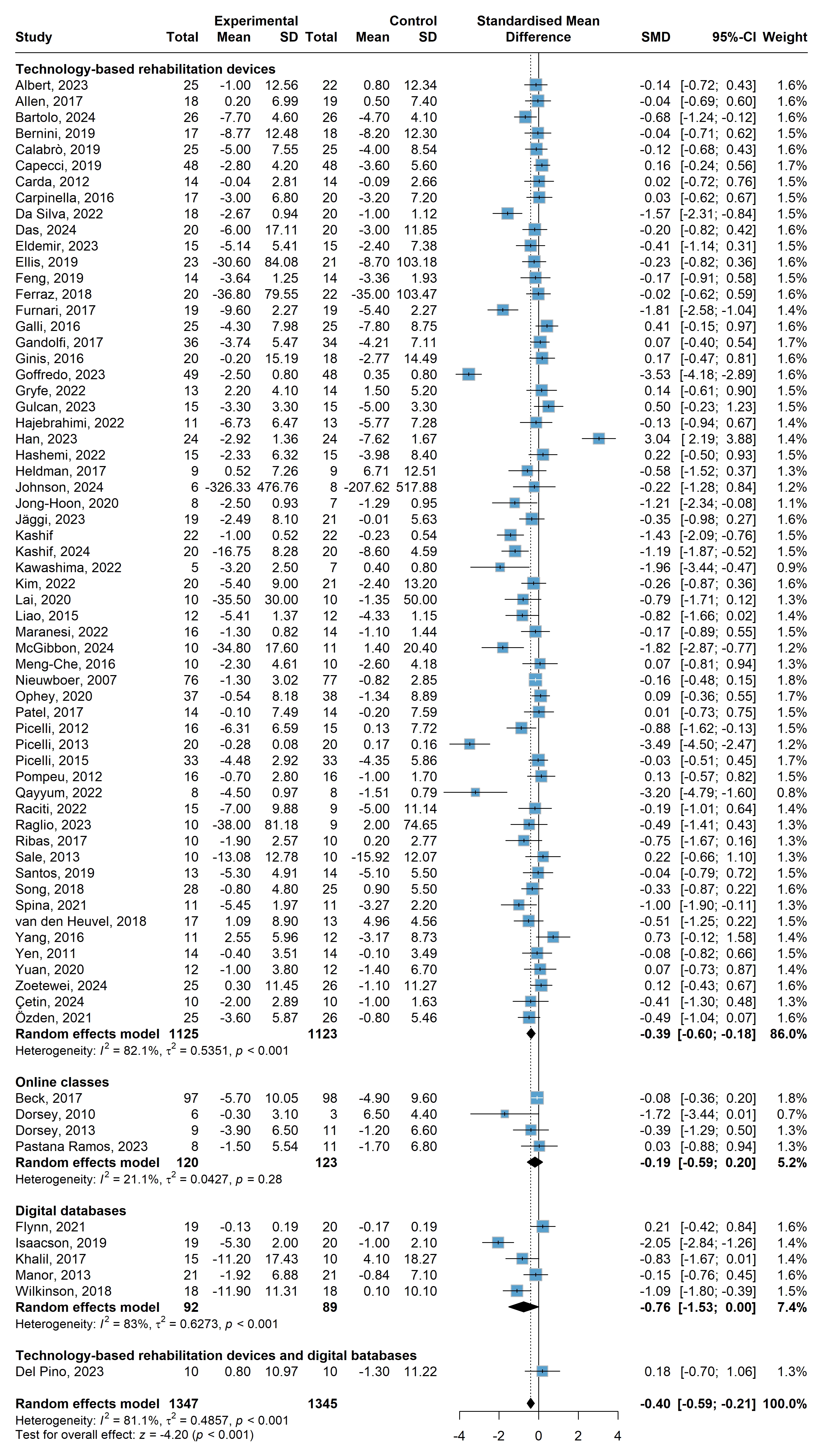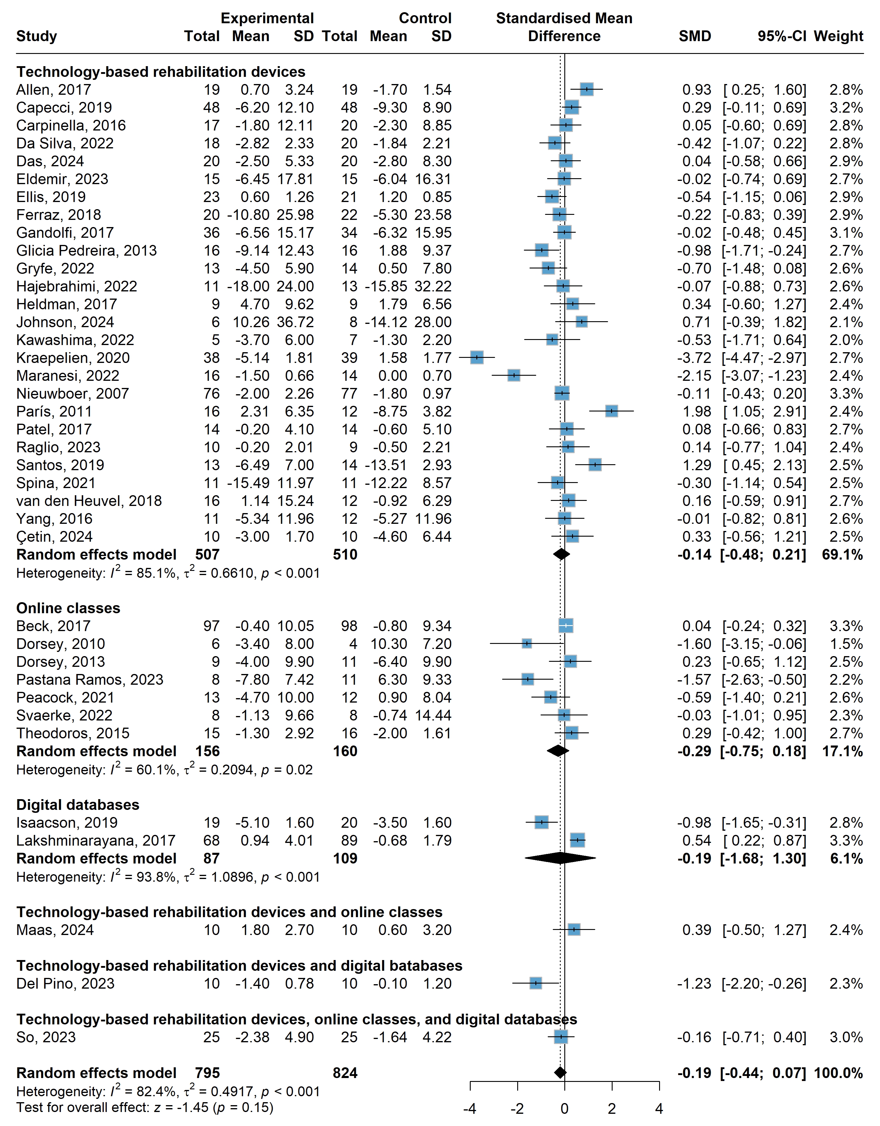 Results: We included 101 RCTs (5,095 patients) in the systematic review and 90 RCTs (4,102 patients) in the meta-analysis. DHIs significantly improved motor symptoms (Figure 1), cognitive function (Figure 2), psychiatric symptoms (Figure 3), and non-motor symptoms (Figure 4), but exhibited no significant improvement in quality of life (Figure 5) at post-intervention assessment. The improvements in motor symptoms, cognitive function, and psychiatric symptoms remained stable at follow-up assessments. Results revealed significant heterogeneity. Meta-regression analysis indicated that age and percentage of females were significant sources of heterogeneity, with older age associated with more beneficial effects on motor symptoms, and a higher percentage of females associated with less favorable effects on psychiatric symptoms.