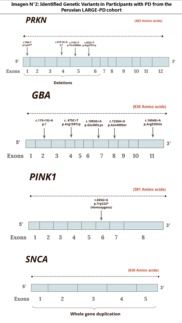 Method: Participants with PD from the Peruvian LARGE-PD cohort, including both previously enrolled and newly recruited participants, were invited to undergo certified genetic testing. The study protocol included IC, pre-test genetic counseling, a demographic questionnaire, blood sample collection, and post-test counseling for results disclosure. Whole-genome sequencing analyzing seven PD-associated genes (GBA1, SNCA, PRKN, PINK1, LRRK2, VPS35, and PINK7), and reporting pathogenic and likely pathogenic variants. Variants outside of this gene panel were not analyzed or reported in this phase of the study.