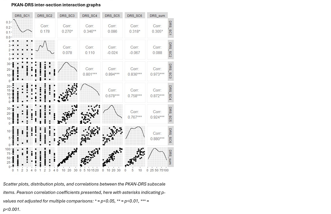 Method: PKAN-DRS was performed on patients with PKAN from 2 referral centres, during clinical visits from 2014-2023. Statistical analyses were performed using R (v.4.3.2). Correlation between clinical scores was assessed using Pearson correlation coefficients, Holm correction was used for multiple comparisons. Time-to-event analysis was performed on Kaplan-Meier cumulative incidence curves.