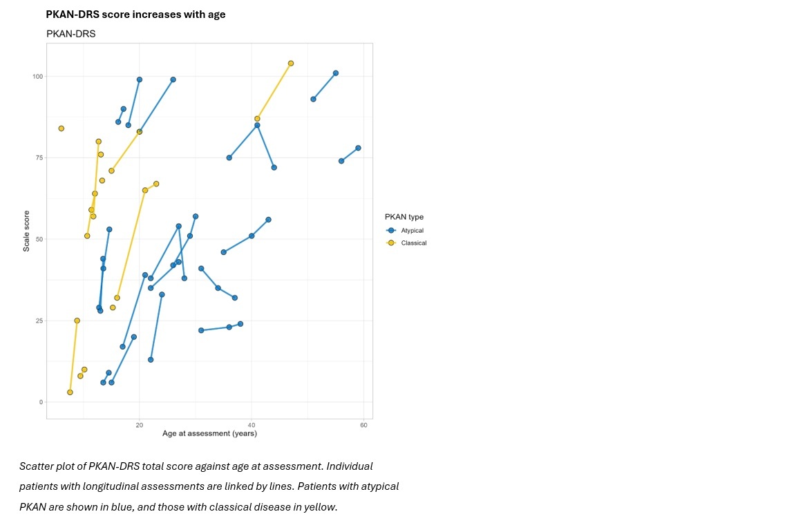 Conclusion: The PKAN-DRS score increases with age, as confirmed by 3 different analyses, with the mixed effects model best accounting for patient variability. Our study provides longitudinal validation of the PKAN-DRS, strengthening  its use in clinical trials. The scale also captured differences among phenotypes, with children having a classic phenotype showing a more rapid progression.