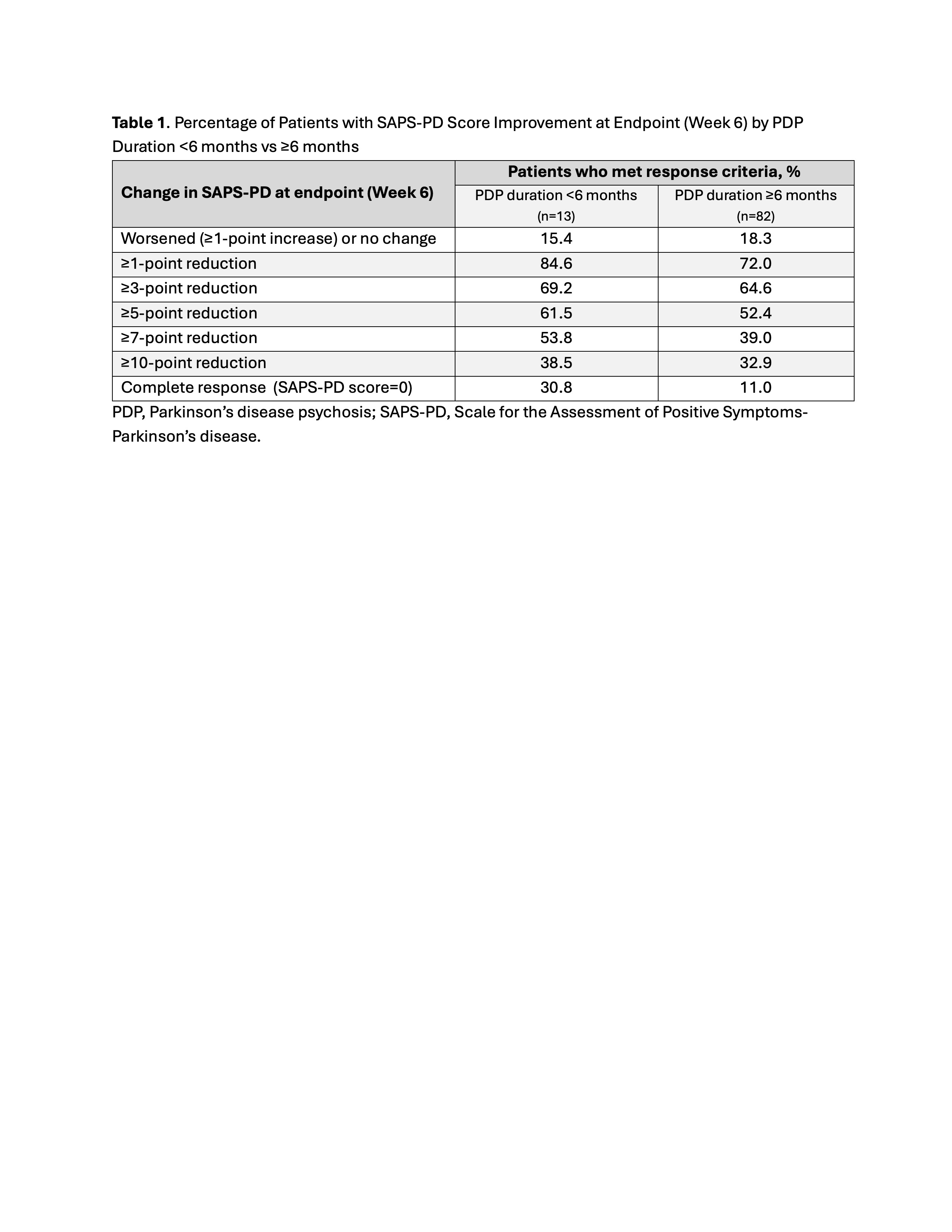 Method: Using data from a pivotal Phase 3, randomized, double-blind, placebo-controlled trial (ACP-103-020), we performed a responder analysis based on the duration of PDP symptoms. Patients with moderate to severe psychotic symptoms and a score ≥3 on a SAPS-HD global item and SAPS-PD non-global item were randomized 1:1 to receive once-daily pimavanserin (34 mg) or placebo for 6 weeks. The primary outcome was the mean change from baseline to week 6 on the SAPS-PD. Individual responses were categorized by SAPS-PD score point reductions of ≥1, ≥3, ≥5, ≥7, ≥10, or complete response (SAPS-PD=0), as well as increases >1 (worsening) or no change.
