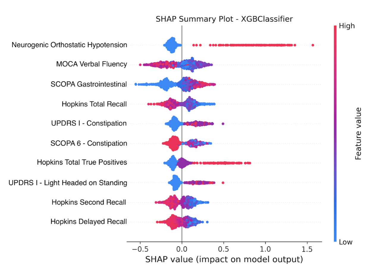 Method: We used data from Parkinson’s Progression Maker Initiative (PPMI) cohort. We trained machine learning models (XGBoost and TabPFN) to predict a-syn status using data from UPDRS- part I activities of daily living, Scales for Outcomes in Parkinson’s disease (SCOPA-autonomic symptoms), Montreal Cognitive Assessment MoCA, blood pressure, Benton Judgement of Line Orientation and Hopkins Verbal Learning Test [5,6]. We employed SHhapley Additive exPlanations (SHAP) to investigate the features with the highest impact on the model’s prediction [7].