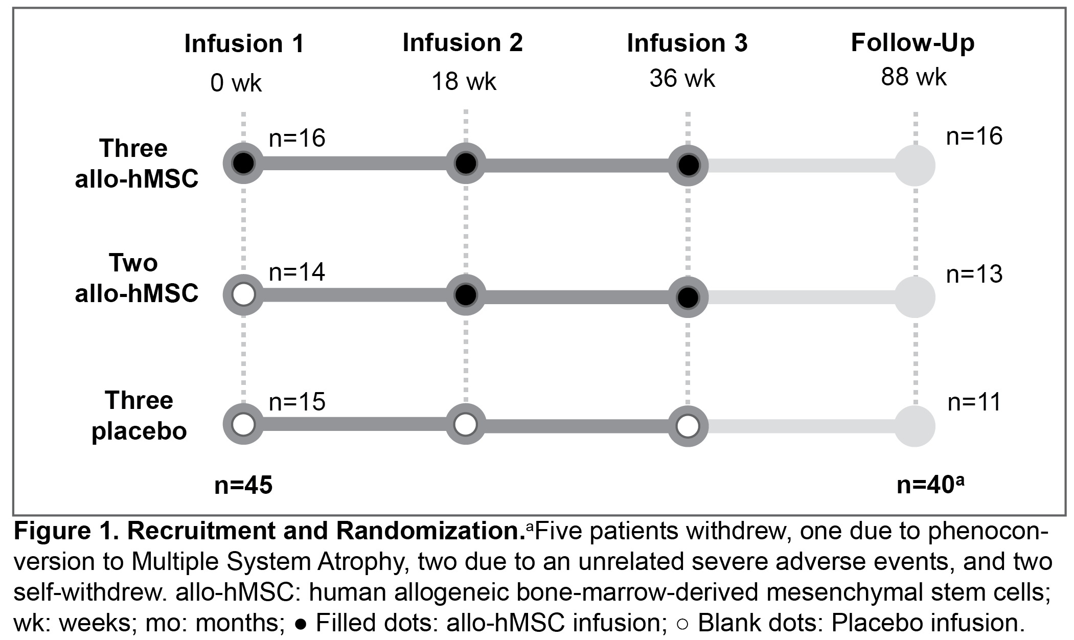 Results: 45 participants PwPD were enrolled, and 40 completed week 88 follow-up (figure1). Demographic and clinical characteristics were similar between groups at baseline (table1). The decrease in PDQ-39 scores was greater in the two-infusion allo-hMSC arm (Mean Difference [MD]: -7.7, Credible Interval [CrI]: -18.8 to 3.7, Posterior Probability [PP]: 90.9%) and the three-infusion allo-hMSC arm (MD: -4.94, CrI: -17.4 to 7.77, PP: 78.1%) (figure2A). Similarly, the EQ-5D-5L Index Score showed a greater increase in the three-infusion allo-hMSC arm (MD: 0.07, CrI: -0.03 to 0.17, PP: 90.0%) and the two-infusion allo-hMSC arm (MD: 0.08, CrI: -0.02 to 0.19, PP: 93.6%)(figure2B).
