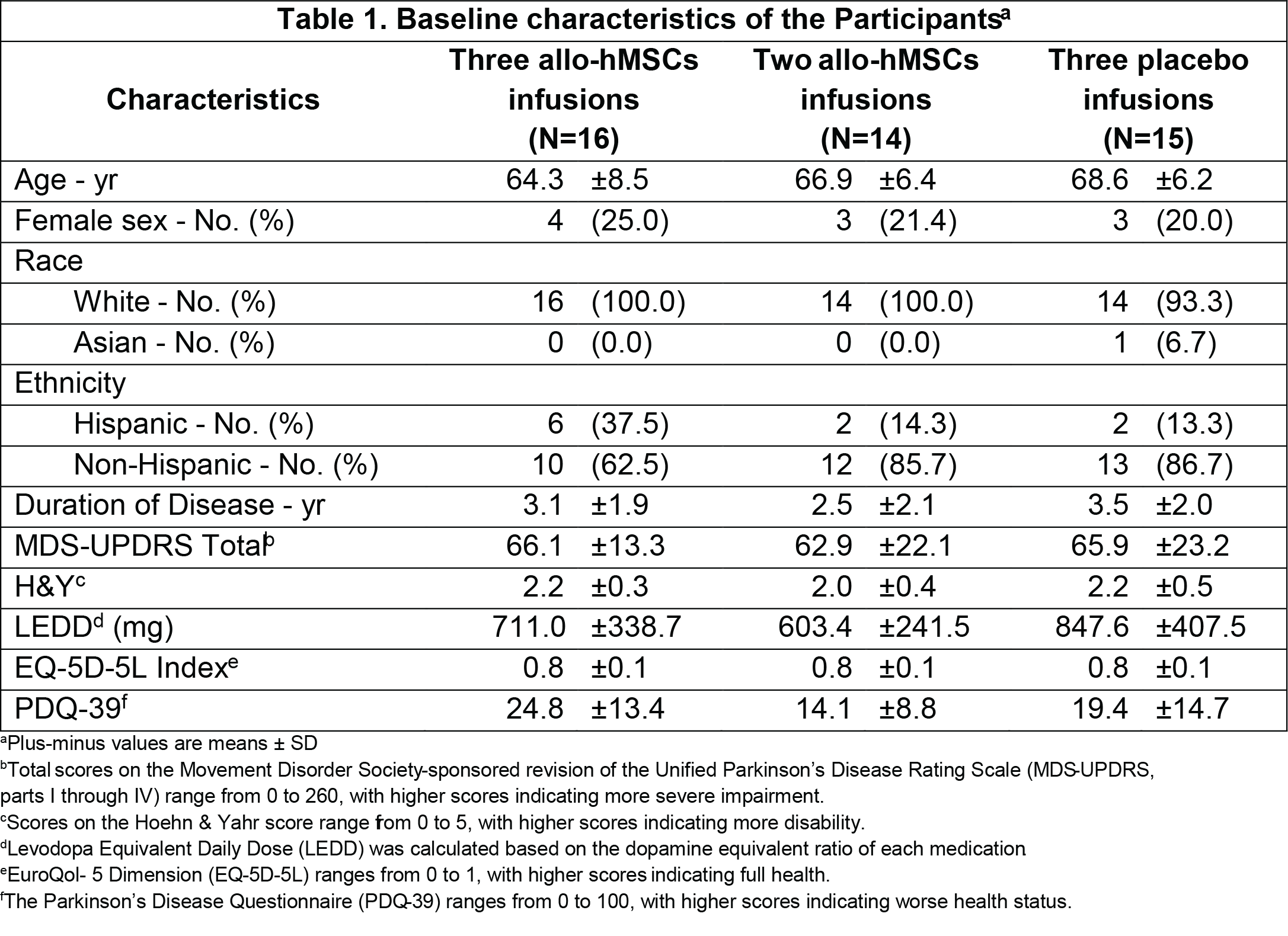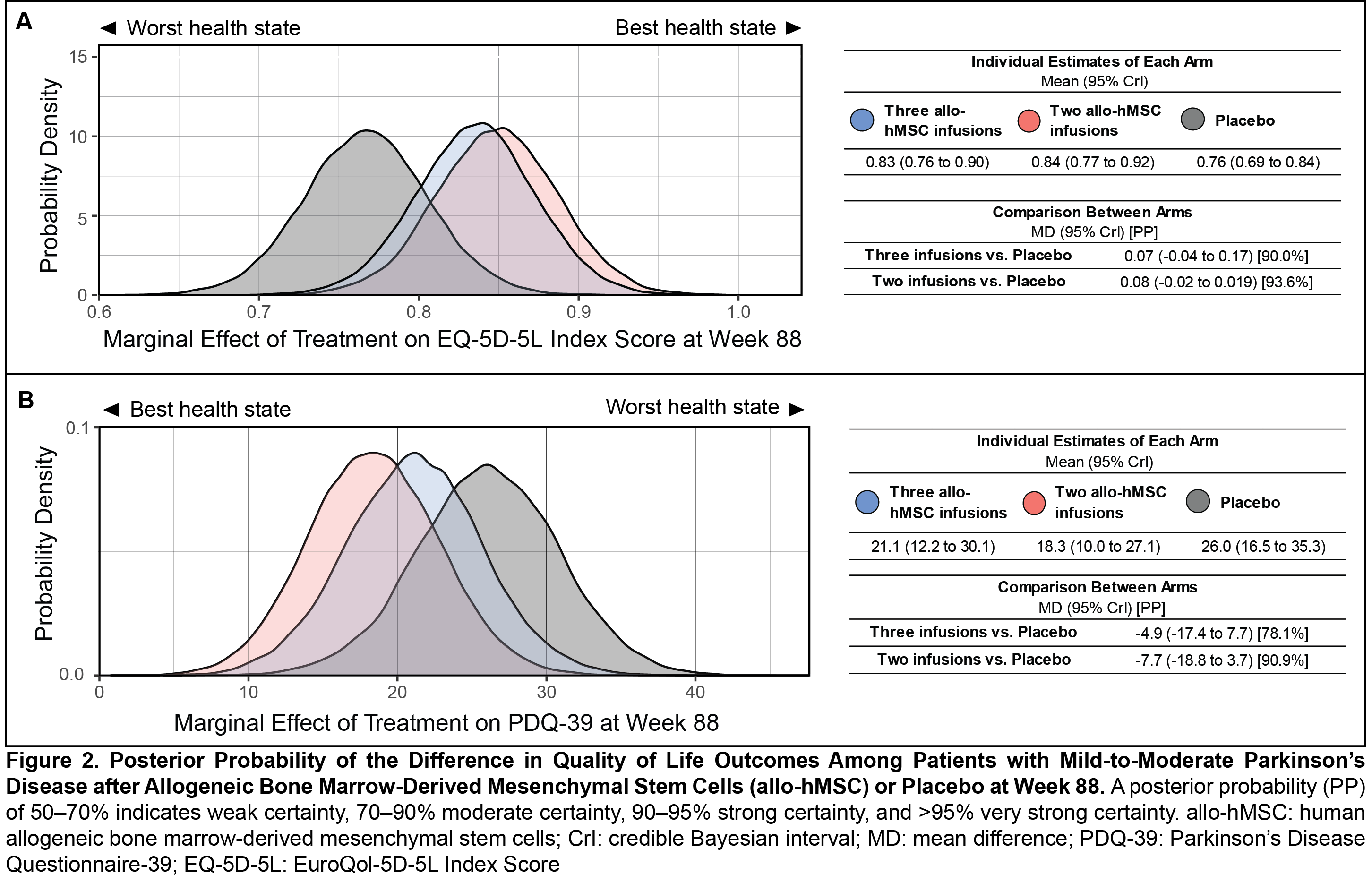 Method: Our investigator-initiated, double-blind, randomized, placebo-controlled phase 2 trial was conducted between November 2020 and July 2023 at a single academic center in the USA. Participants included men and women aged 50–79 years with mild-to-moderate PD (Hoehn & Yahr stages 1–3, disease duration of 2–10 years). They were randomized into one of three groups: (1) three IV infusions of 10×10⁶ allo-hMSCs/kg (N=16), (2) an IV placebo infusion followed by two IV infusions of 10×10⁶ allo-hMSCs/kg (N=14), or (3) three IV placebo infusions (N=15). Infusions were administered at 18-week intervals, with follow-up conducted at week 88. Secondary outcomes included QoL assessments using the Parkinson’s Disease Questionnaire (PDQ-39), and the EuroQol (EQ)-5D-5L Index Score at baseline and 88 weeks. Bayesian statistical analysis determined the posterior probability of change from baseline between treatment arms. Data were analyzed using R v.4.2.0.