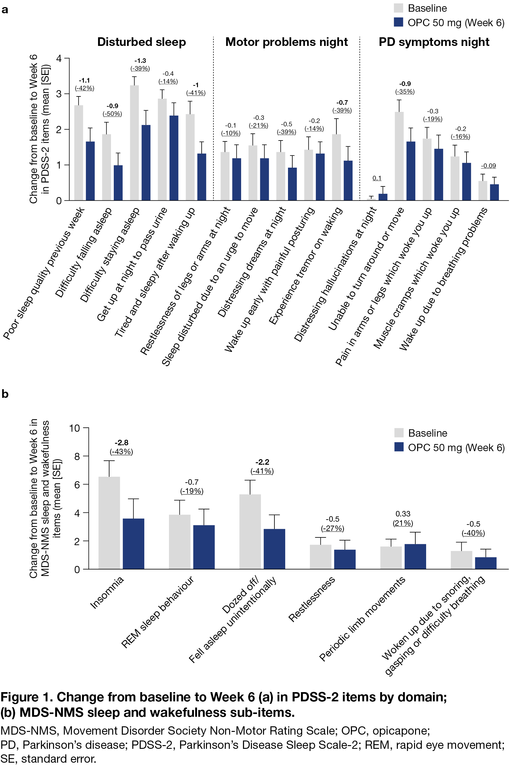 Method: The 6-week, open-label, single-arm OpicApone in Sleep dISorder (OASIS) trial evaluated the efficacy of OPC 50 mg in treating sleep disturbances as levodopa add-on therapy. Primary endpoint was change from baseline to Week 6 in PD Sleep Scale-2 (PDSS-2) total score. This post-hoc analysis evaluated changes in specific PDSS-2 items and Movement Disorder Society-sponsored NMS rating scale (MDS-NMS) domains at Week 6.