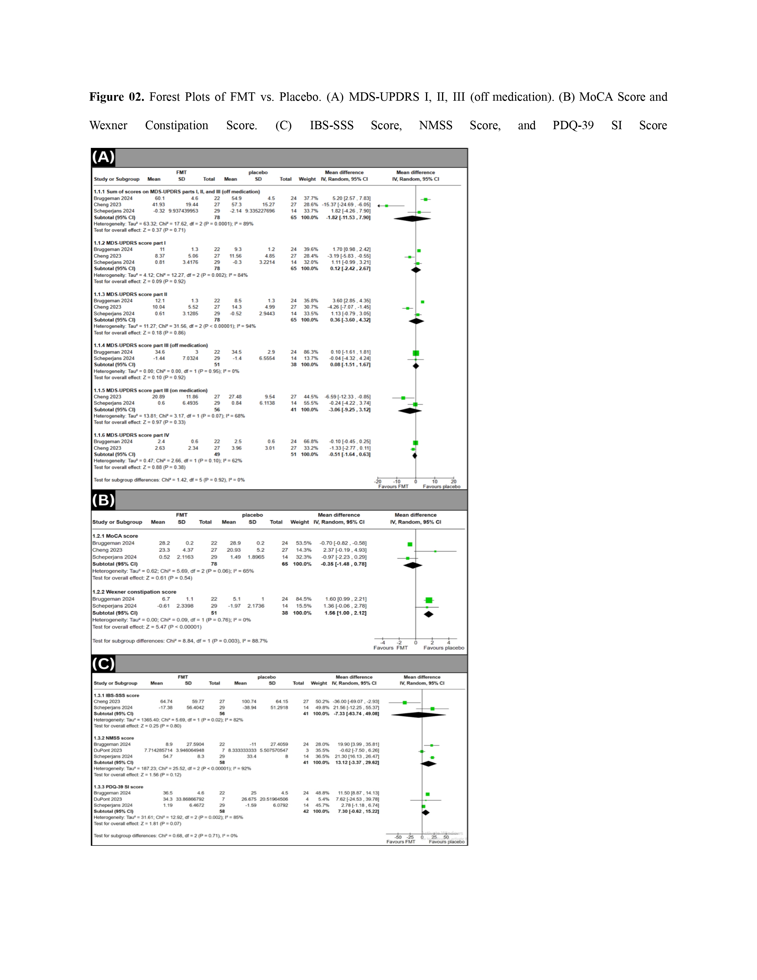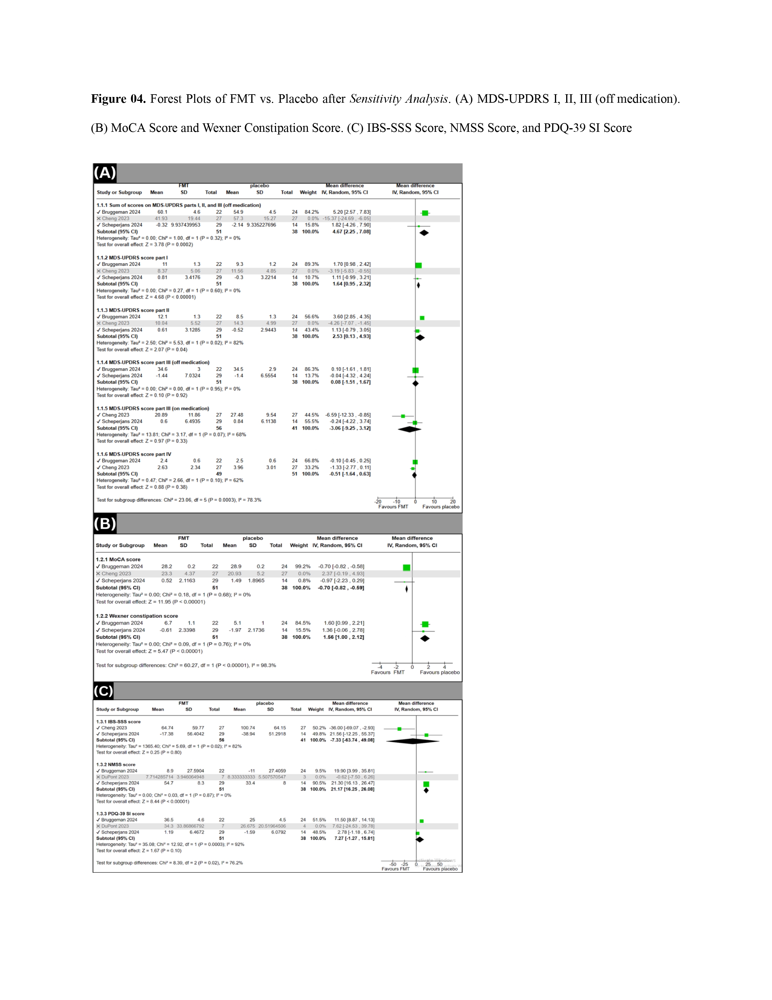 Results: We analyzed four RCTs comprising 157 patients, 87 undergoing allogenic FMT and 70 receiving either placebo or autologous FMT [2-5]. Surprisingly, the Wexner Constipation Score showed significant improvement in the Placebo group (MD 1.56, 95% CI [1.00, 2.12]; p < 0.00001). However, no significant improvement was observed in the Movement Disorder Society Unified Parkinson’s Disease Rating Scale (MDS-UPDRS) (MD -1.83, 95% CI [-7.09, 3.44], p = 0.50), which was the primary outcome. Similarly, secondary outcomes, including the Irritable Bowel Syndrome Symptom Severity Scale (IBS-SSS) score, levodopa-equivalent daily dose (LEDD) (mg), Non-Motor Symptoms Scale (NMSS), Montreal Cognitive Assessment (MoCA), and Parkinson Disease Questionnaire Summary Index (PDQ-39 SI) score, showed no significant improvement. A sensitivity analysis was conducted due to high heterogeneity, revealing no significant changes in the primary outcome. However, the NMSS score (before: MD 1.17, 95% CI [-0.03, 2.36], p = 0.06) showed improvement following the sensitivity analysis (after: ). Reported adverse effects in the FMT group included stomach ache, nausea, gastrointestinal dysfunction, and worsening anxiety.