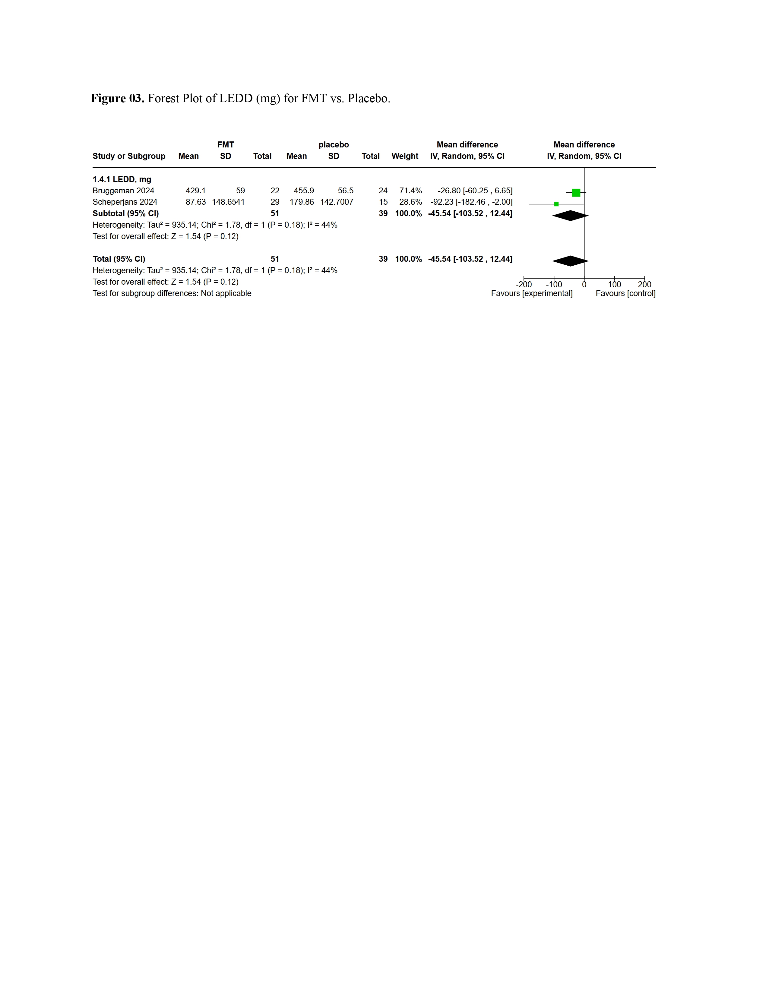 Method: PubMed, EMBASE, and Cochrane Central databases were searched for randomized controlled trials (RCTs) comparing FMT with placebo. Efficacy and safety outcomes were analyzed using Review Manager 5.4, with mean differences (MDs) calculated using random-effects models.