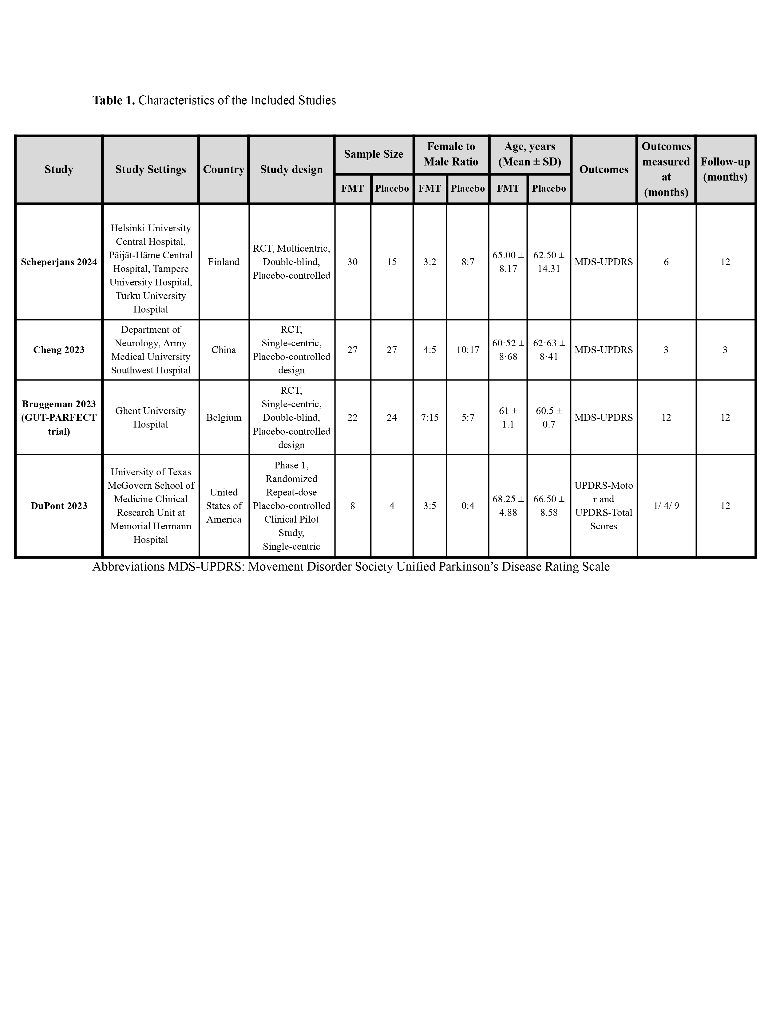 Background: FMT is a novel therapy for PD due to its potential to modulate gut-brain axis interactions. Evidence suggests gut dysbiosis may contribute to PD symptom progression [1]. This systematic review and meta-analysis assess the efficacy and safety of FMT in alleviating motor and non-motor symptoms in PD patients.