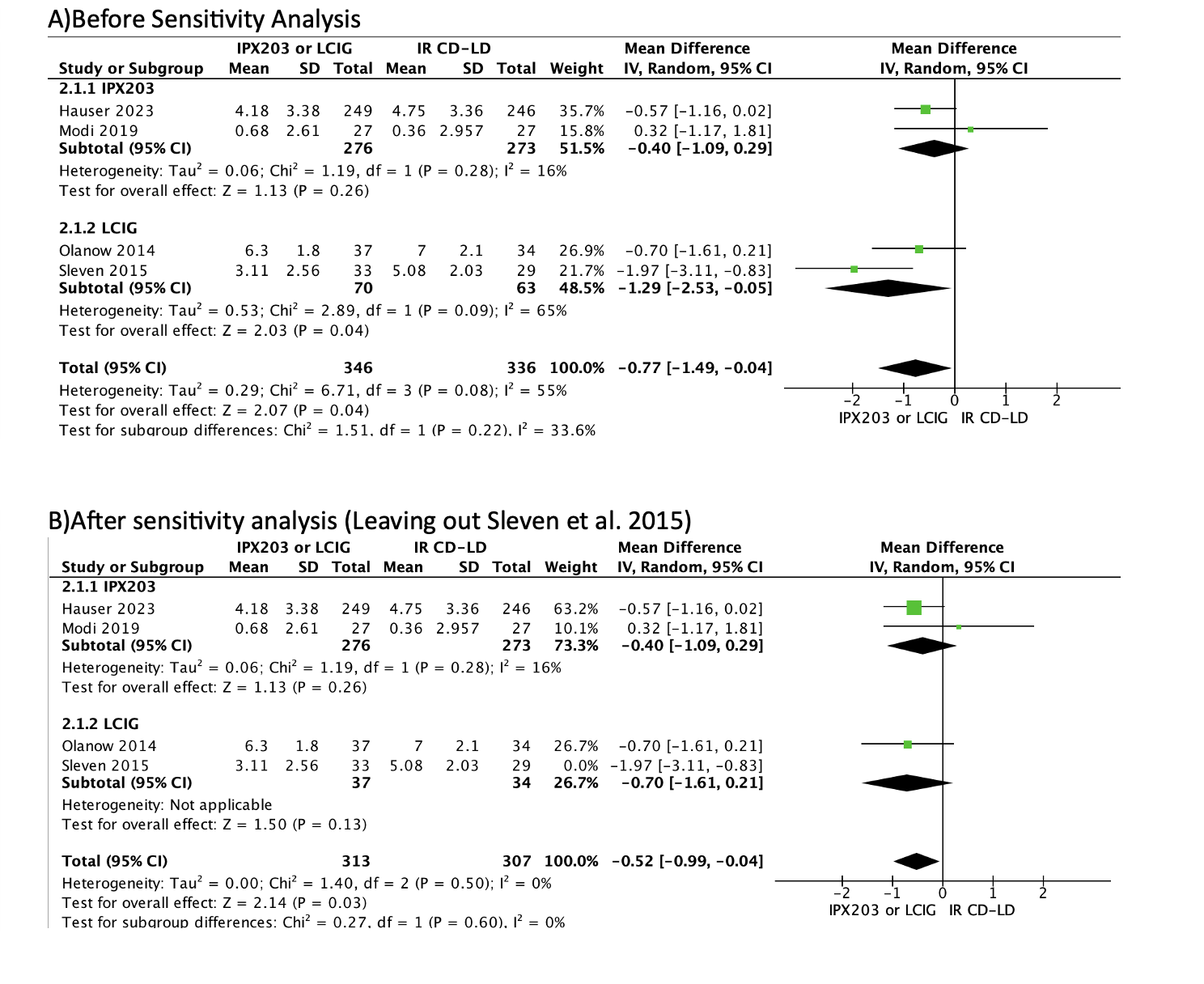 Method: A systematic search was conducted on PUBMED, SCOPUS, and WOS to find eligible RCTs comparing IPX203 or LCIG to IR CD-LD. The risk of bias 2 tool was used for quality assessment. The study was conducted using random-effects models. Sensitivity analyses and subgrouping assessed the strength of the evidence.