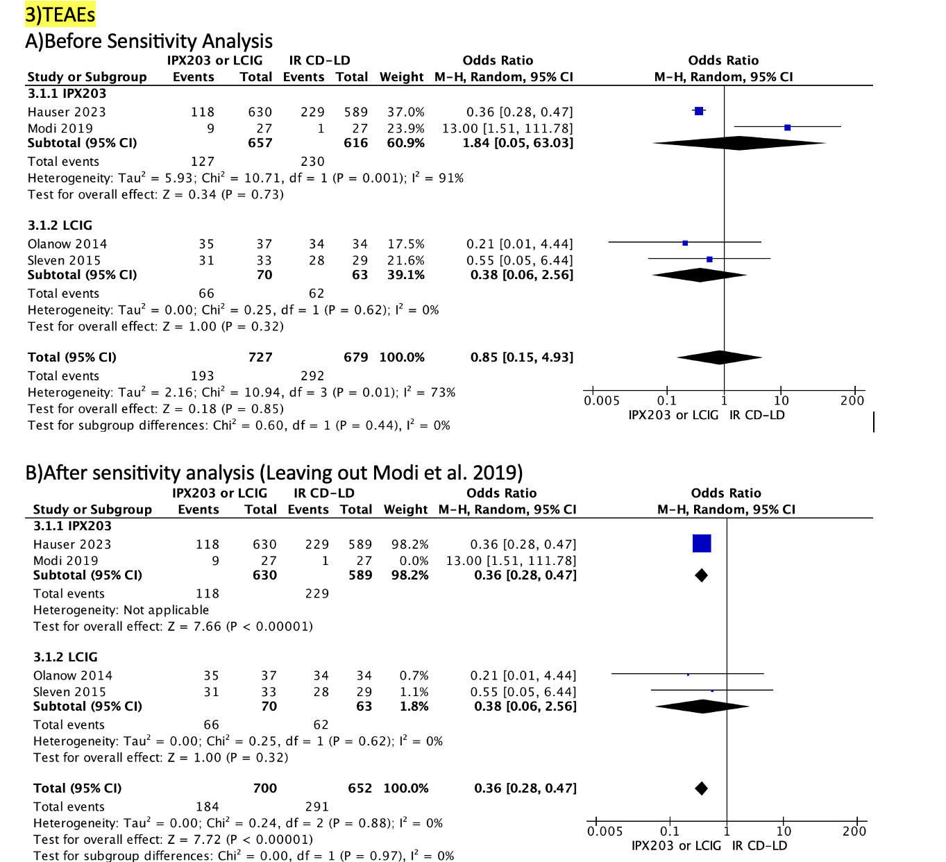 Results: Four RCTs with 682 patients met inclusion criteria. IPX203 did not significantly reduce OFF time (MD: -0.40 hours; 95% CI: -1.09, 0.29; p = 0.26), while LCIG significantly reduced OFF time (MD: -1.29 hours; 95% CI: -2.53, -0.05; p = 0.04). The overall pooled estimate showed a moderate reduction in OFF time (MD: -0.77 hours; 95% CI: -1.49, -0.04; p = 0.04). Sensitivity analysis excluding Slevin 2015 confirmed OFF time reduction (MD: -0.52; p = 0.04) with reduced heterogeneity (I² = 0%) [Figure1]. ON time with troublesome dyskinesia showed no significant difference between groups (MD: 0.10; 95% CI: -0.40, 0.59; p = 0.70) [Figure2]. After sensitivity analysis, LCIG confirmed a favorable safety profile, with fewer treatment-emergent adverse events (OR: 0.36; p < 0.0001).[Figure3]
