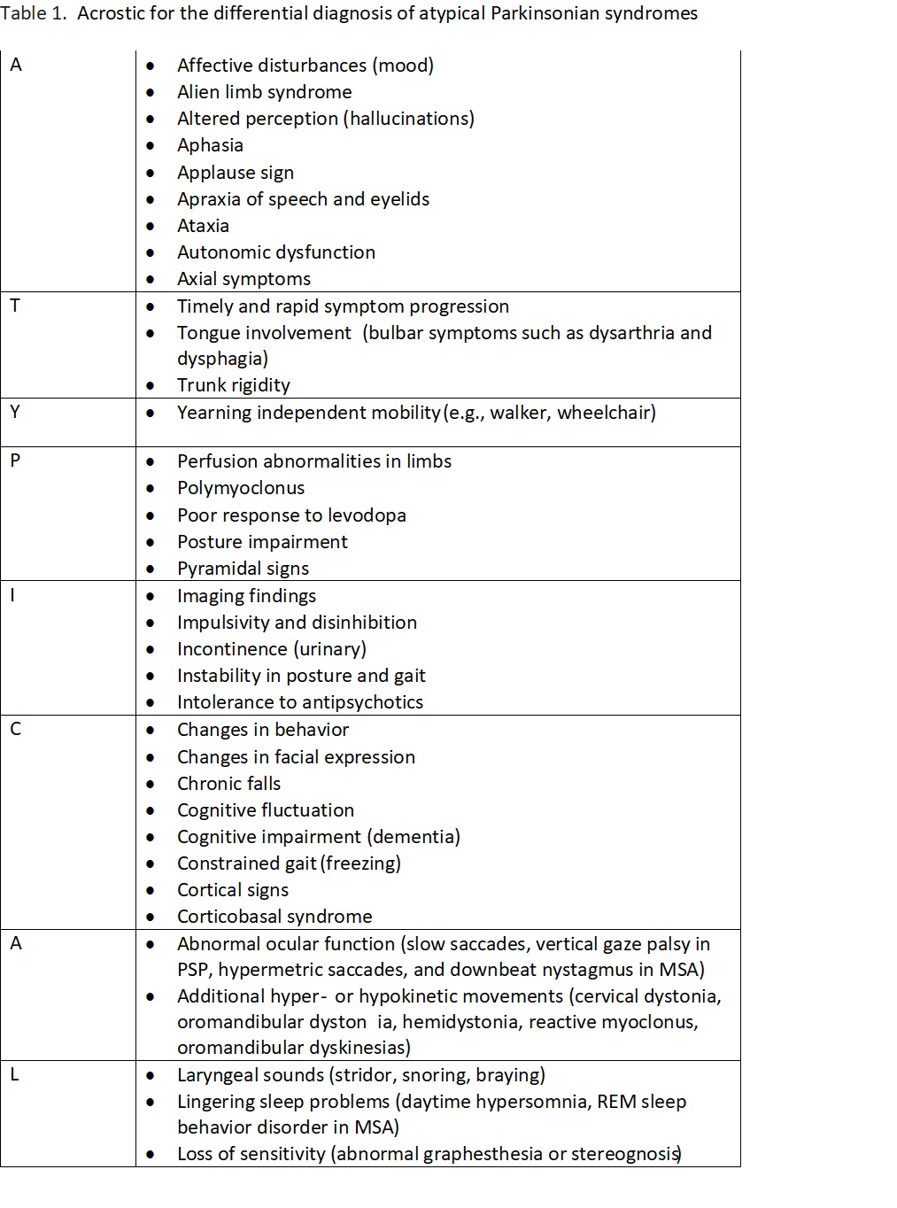 Objective: To develop a structured clinical acrostic for the differential diagnosis of atypical Parkinsonian syndromes.