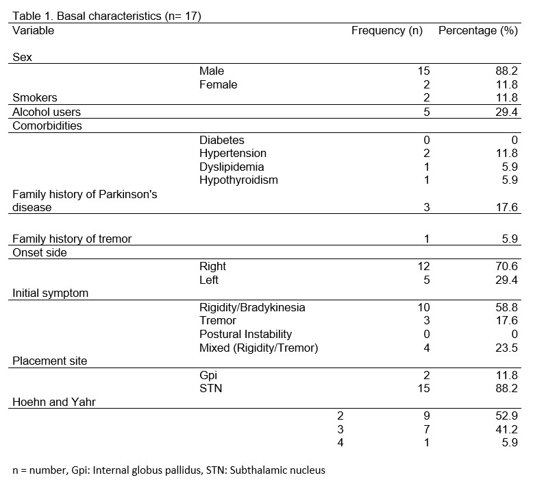 Results: Seventeen patients were included. The most prevalent initial symptom was rigidity/bradykinesia (58.8%). The most frequent clinical stage, based on Hoehn and Yahr, was stage 2 (52.9%). Significant differences were observed in MDS-UPDRS scores (16.76, p = 0.019) and NMSS scores (20.41, p = 0.038). The NMSS subdomains with significant differences were sleep/fatigue (p = 0.038) and miscellaneous symptoms (p = 0.002). Three patients developed postoperative hallucinations.