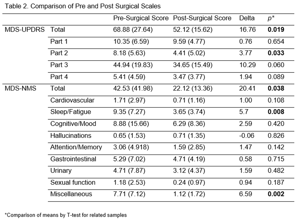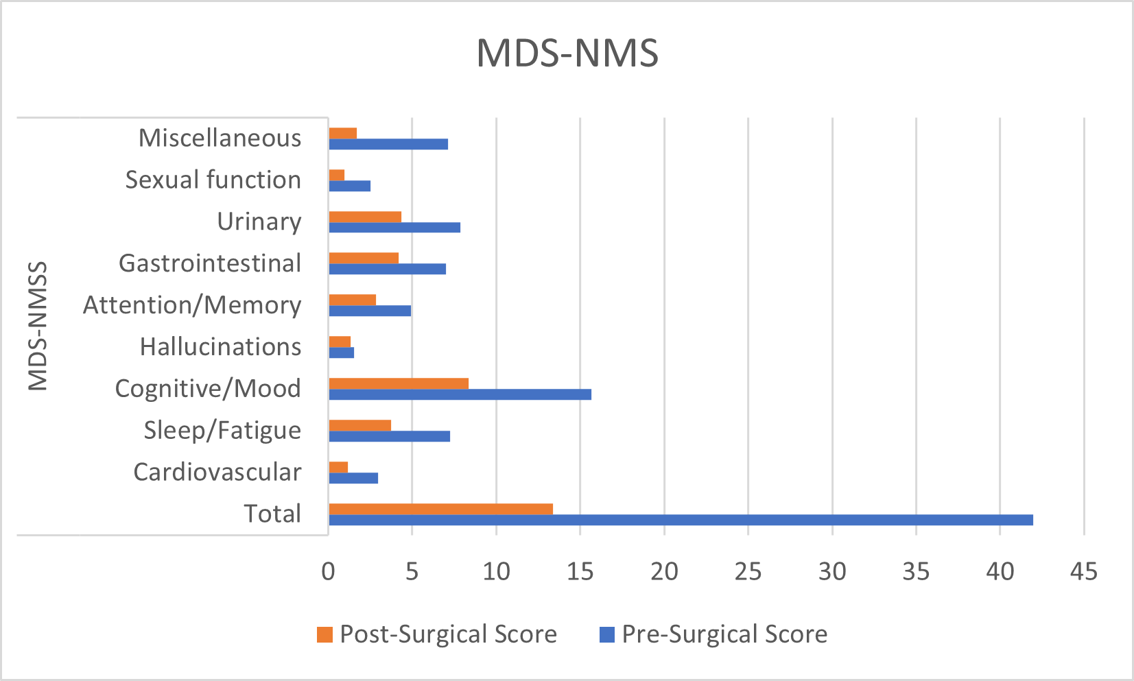 Method: This retrospective cohort included PD patients who underwent bilateral STN-DBS. The Non-Motor Symptoms Scale (NMSS) and Movement Disorder Society – Unified Parkinson’s Disease Rating Scale (MDS-UPDRS) were used for pre- and postoperative assessments. Paired t-tests analyzed differences in means of quantitative variables.