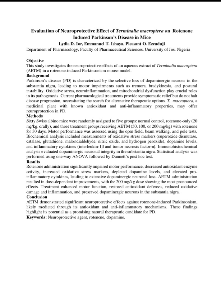 MDS Abstracts - https://www.mdsabstracts.org/abstract/evaluation-of-neuroprotective-effect-of-terminalia-macroptera-on-rotenone-induced-parkinsons-disease-in-mice/
