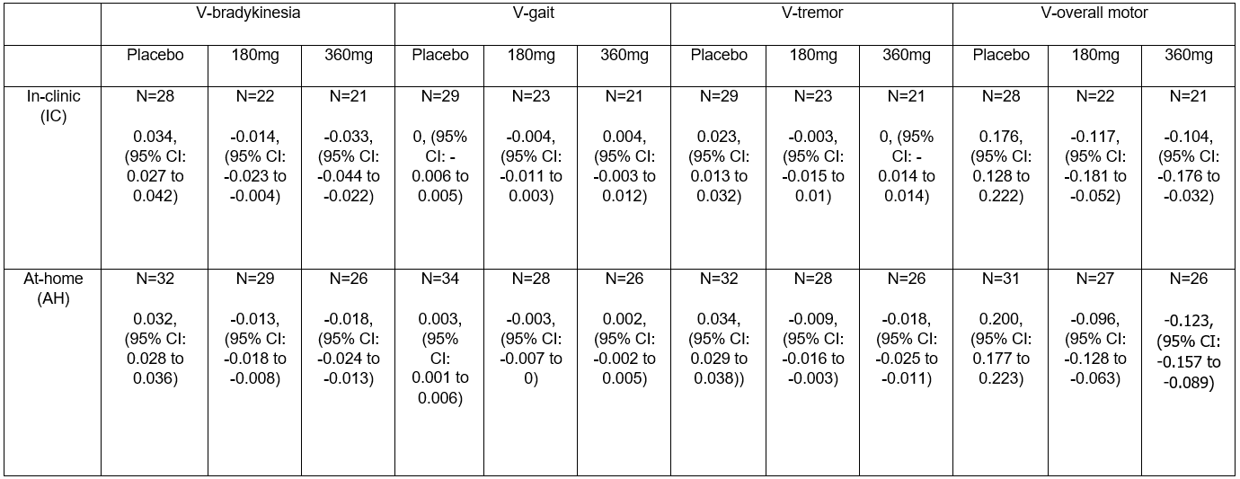 Method: VMEs were performed during in-clinic (IC) visits (every 2 months) and at-home (AT, once a week) for 18 months. Four composites (V-gait, V-bradykinesia, V-tremor and V-overall motor) were derived from the VMEs. To investigate the composite changes from baseline in the arms, linear random coefficients mixed-effects models were used, in which time (weeks), treatment × time, and baseline characteristics (age, sex, disease duration and baseline value of the composite) were entered as fixed effects, with subject as random intercept. Data used for modelling was censored when patients started symptomatic treatment.