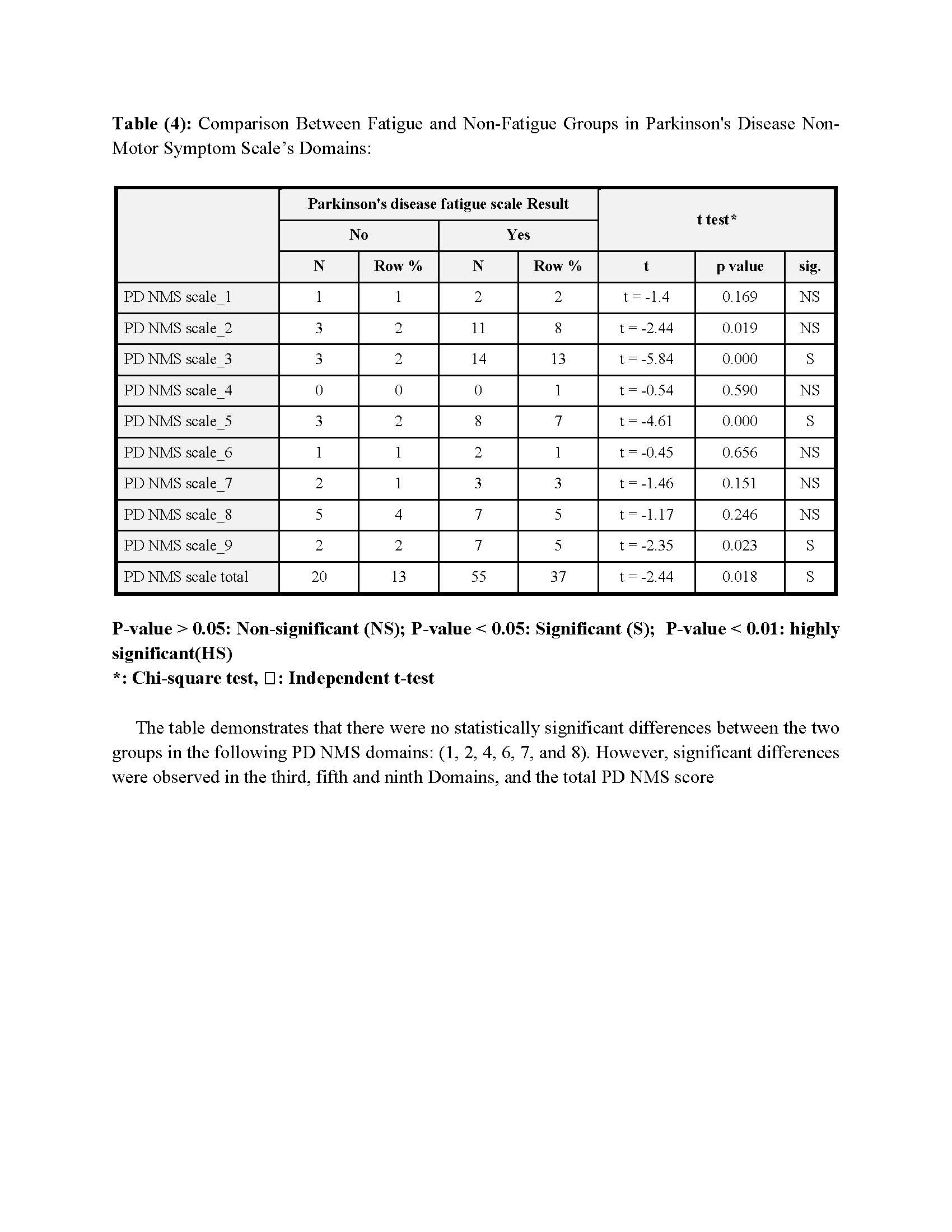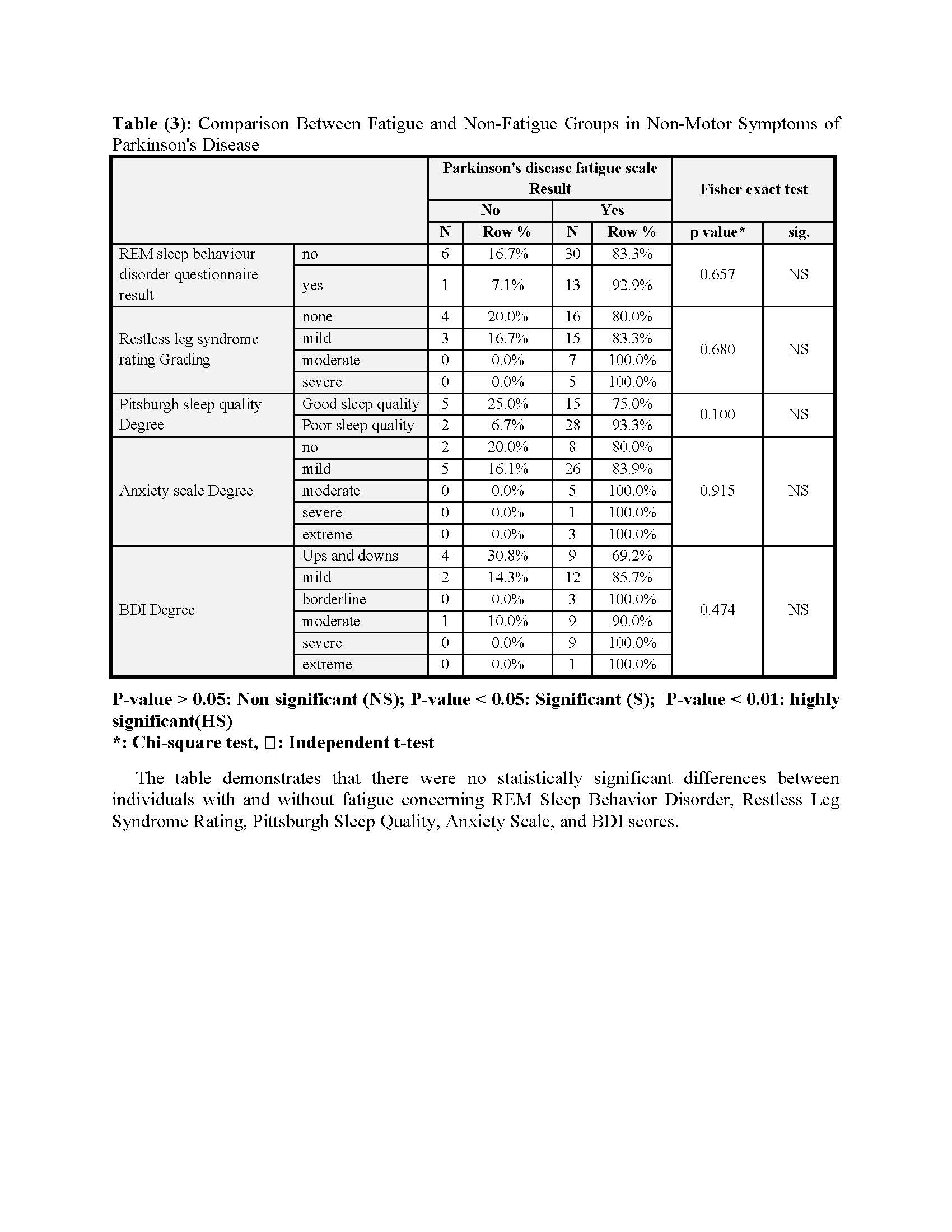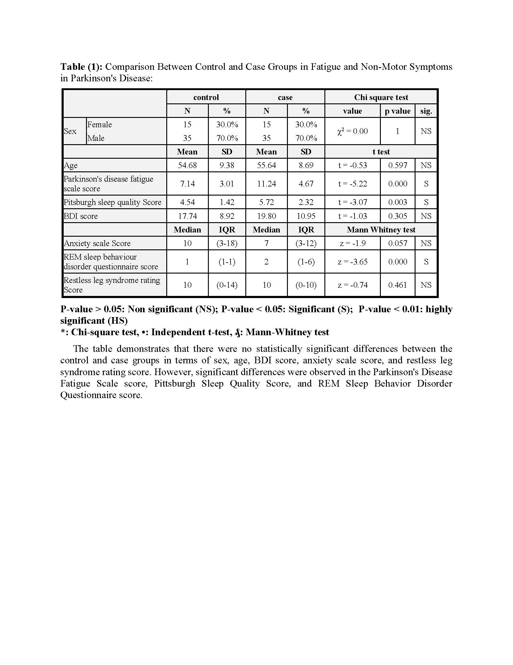 Method: A case-control study was conducted on 50 patients with Parkinson’s disease attending the movement disorders outpatient clinic at Ain Shams University Hospital, along with 50 control subjects who were relatives or accompanying persons of the patients. All patients were subjected to detailed history and MRI brain. Diagnosis was based on the MDS 2015 criteria combined with UK brain bank criteria. The assessment tools included the Unified Parkinson’s Disease Rating Scale (UPDRS), Parkinson’s Disease Non-Motor Symptoms Questionnaire (PD NMS), Parkinson’s Disease Fatigue Scale, Pittsburgh Sleep Quality Index, REM Sleep Behavior Disorder Scale, Restless Legs Syndrome Scale, Beck Depression Inventory (BDI), and Parkinson’s Anxiety Scale. Statistical analysis was performed using SPSS 22.