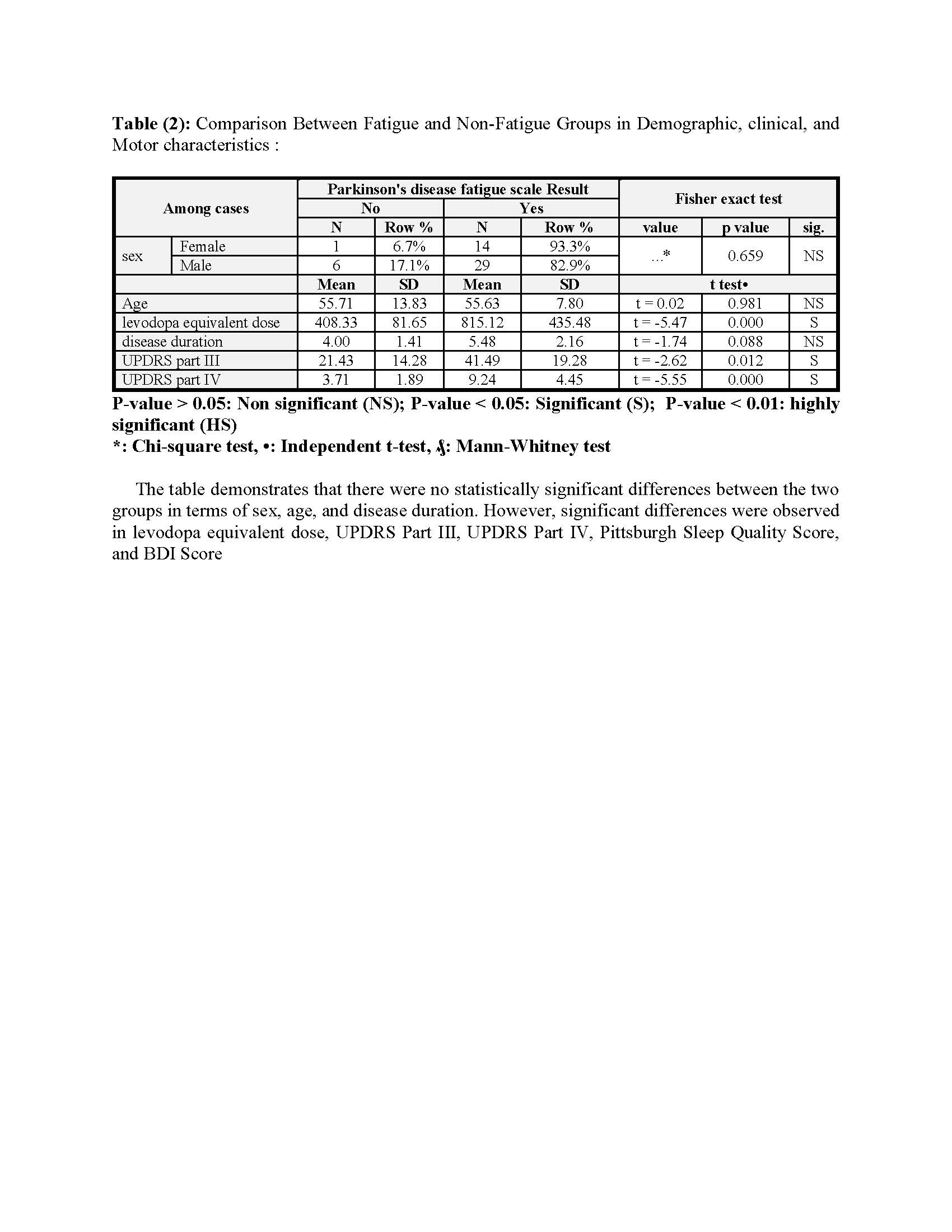 Results: The study showed a significantly higher fatigue score in the PD group (11.24 ± 4.67) compared to controls (7.14 ± 3.01) (p = 0.000). There was a significant correlation between the fatigue scale and levodopa equivalent dose (815.12 ± 435.48 mg, p = 0.000), UPDRS part III (41.49 ± 19.28, p = 0.012), UPDRS part IV (9.24 ± 4.45, p = 0.000), and Pittsburgh Sleep Quality Index (5.95 ± 2.40, p = 0.004). A moderate correlation was also found with the Beck Depression Inventory (21.23 ± 10.84, p = 0.008). However, there was no significant correlation with anxiety (p = 0.573), REM sleep behavior disorder (p = 0.182), or restless leg syndrome (p = 0.154).