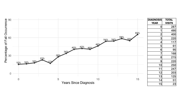 Conclusion: The percentage of PPMI participants with ≥ 1 yearly fall increased with both years since disease diagnosis and higher NSD-ISS. Nearly half of PwP reported ≥ 1 yearly fall by year 10 since diagnosis and at NSD-ISS stage 4.