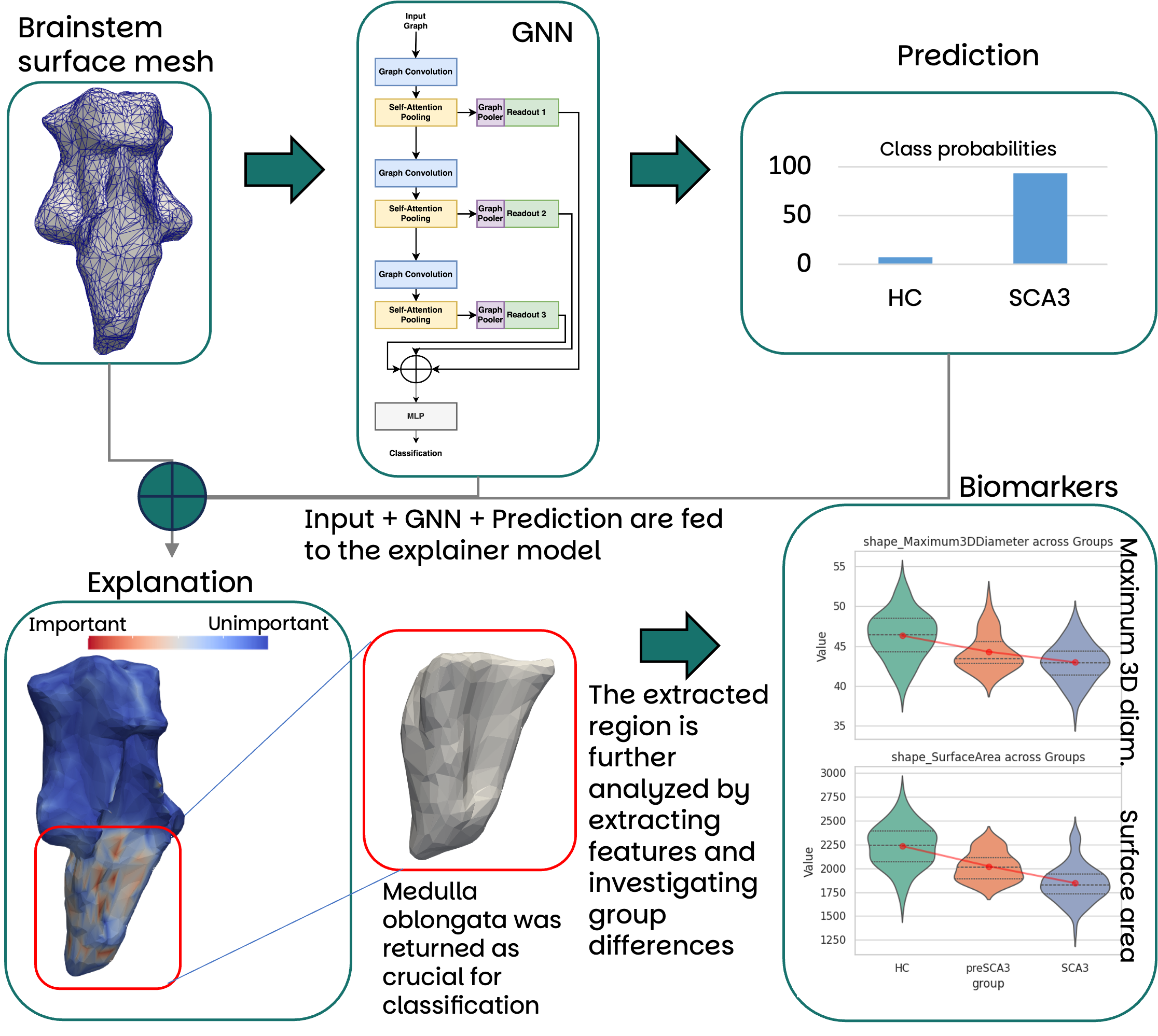 Conclusion: This study demonstrated that GNNs can effectively model brainstem shape alterations in SCA3. The XAI approach successfully identified key regions showing significant differences between groups both in the early stages (HC vs. preSCA3) and in the later, symptomatic stages of the disease (HC vs. SCA3). The presented approach of AI-guided biomarker discovery, generalizable to other conditions, can accelerate the identification of biomarkers in SCA3 and other neurological disorders.