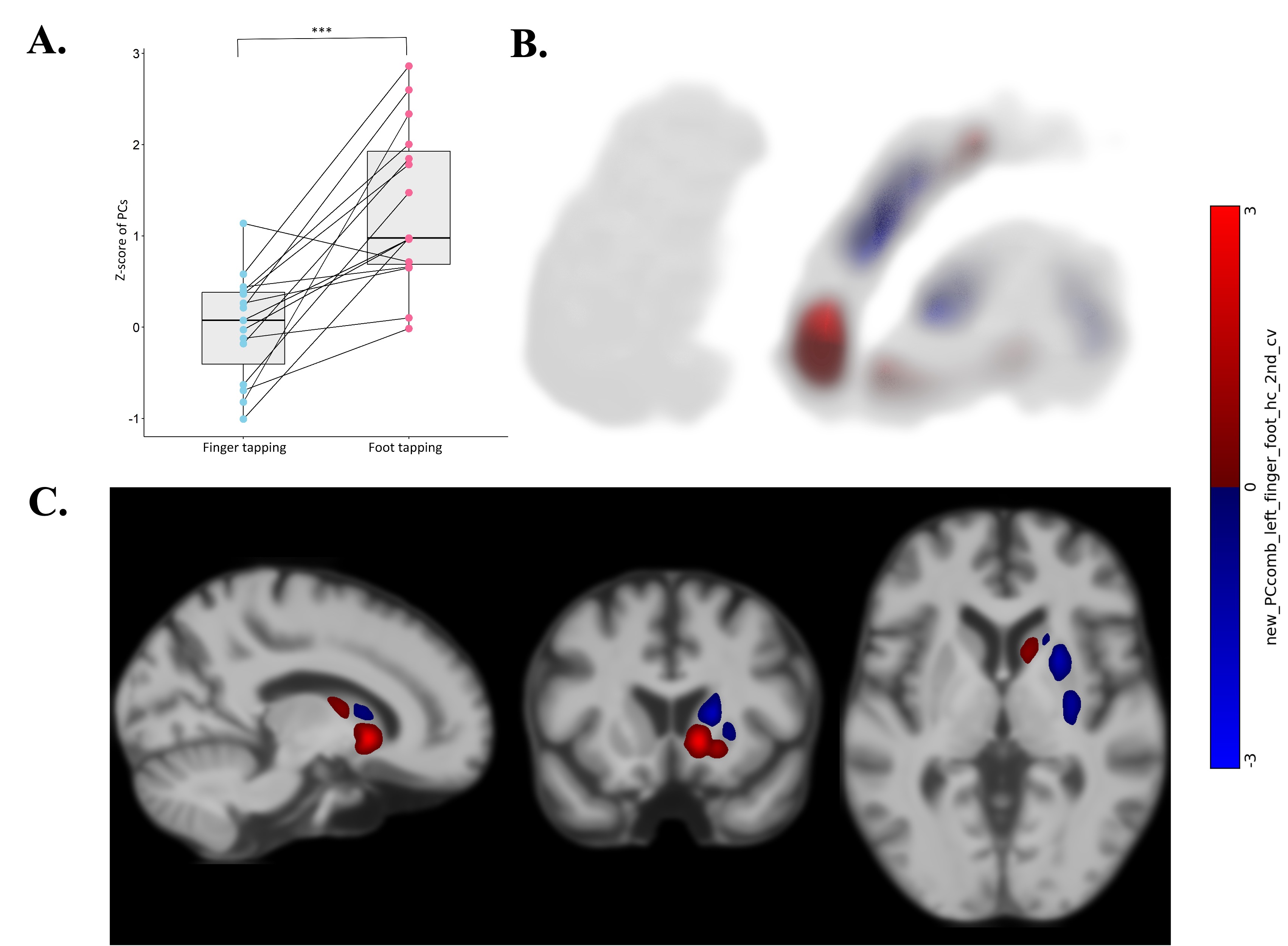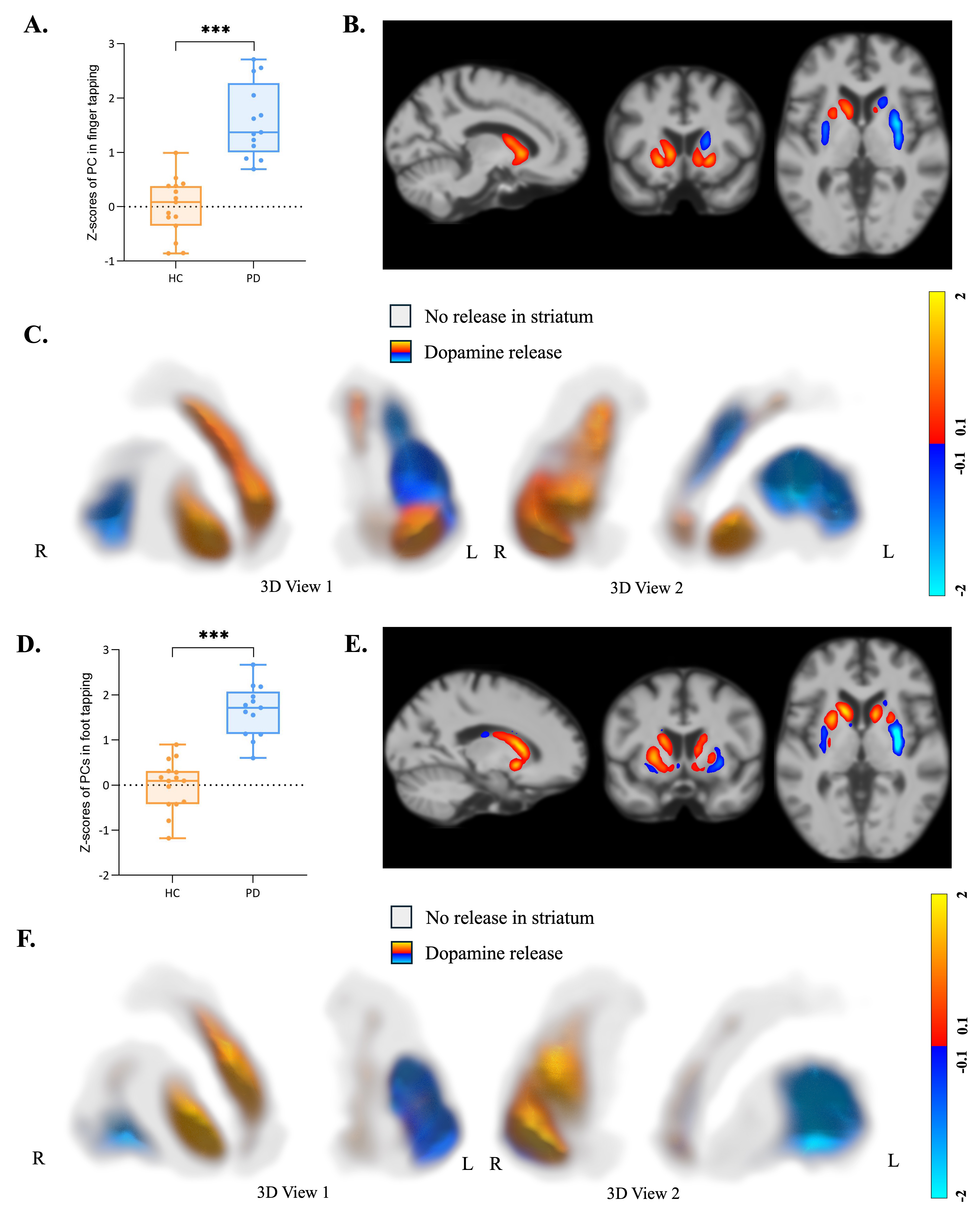 Conclusion: Compared with HC, PD subjects exhibited distinct activation patterns, with predominant activation in large ipsilateral clusters during tapping. In HC, functional loops are typically segregated, with clear anatomical distinctions between striatal regions associated with specific functions. However, in PD, these distinctions appear blurred, suggesting a loss of anatomical segregation of DA release.