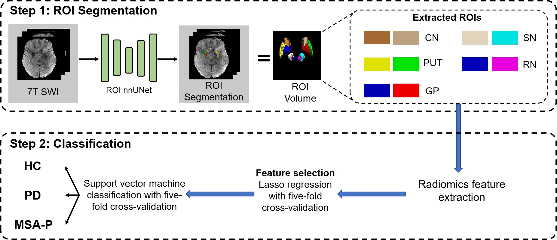 Method: 111 PD patients, 35 multiple system atrophy parkinsonian type (MSA-P) patients, and 68 healthy controls (HC) underwent 7T high-resolution SWI. Radiomics features were extracted from five subcortical nuclei including the caudate nucleus, putamen, globus pallidus, substantia nigra, and red nucleus. For each nucleus, 1132 features was extracted from original images, gradient images, wavelet transformed images, and gamma transformed images. Lasso regression selected 64 features, and a classification model was constructed using support vector machine (SVM) with five-fold cross-validation [figure1].