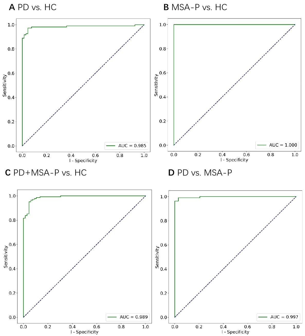 Results: The radiomics signatures demonstrated robust diagnostic efficacy. For PD vs. HC, sensitivity was 97.2%, specificity 93.9%, accuracy 96.0%, AUC 0.985, and F1 score 0.968. For MSA-P vs. HC, sensitivity, specificity, and accuracy were 100%, with AUC and F1 score of 1.000. For PD and MSA-P vs. HC, sensitivity was 95.1%, specificity 93.9%, accuracy 94.7%, AUC 0.989, and F1 score 0.961. For PD vs. MSA-P, sensitivity was 99.1%, specificity 91.2%, accuracy 97.2%, AUC 0.997, and F1 score 0.982 [figure2].