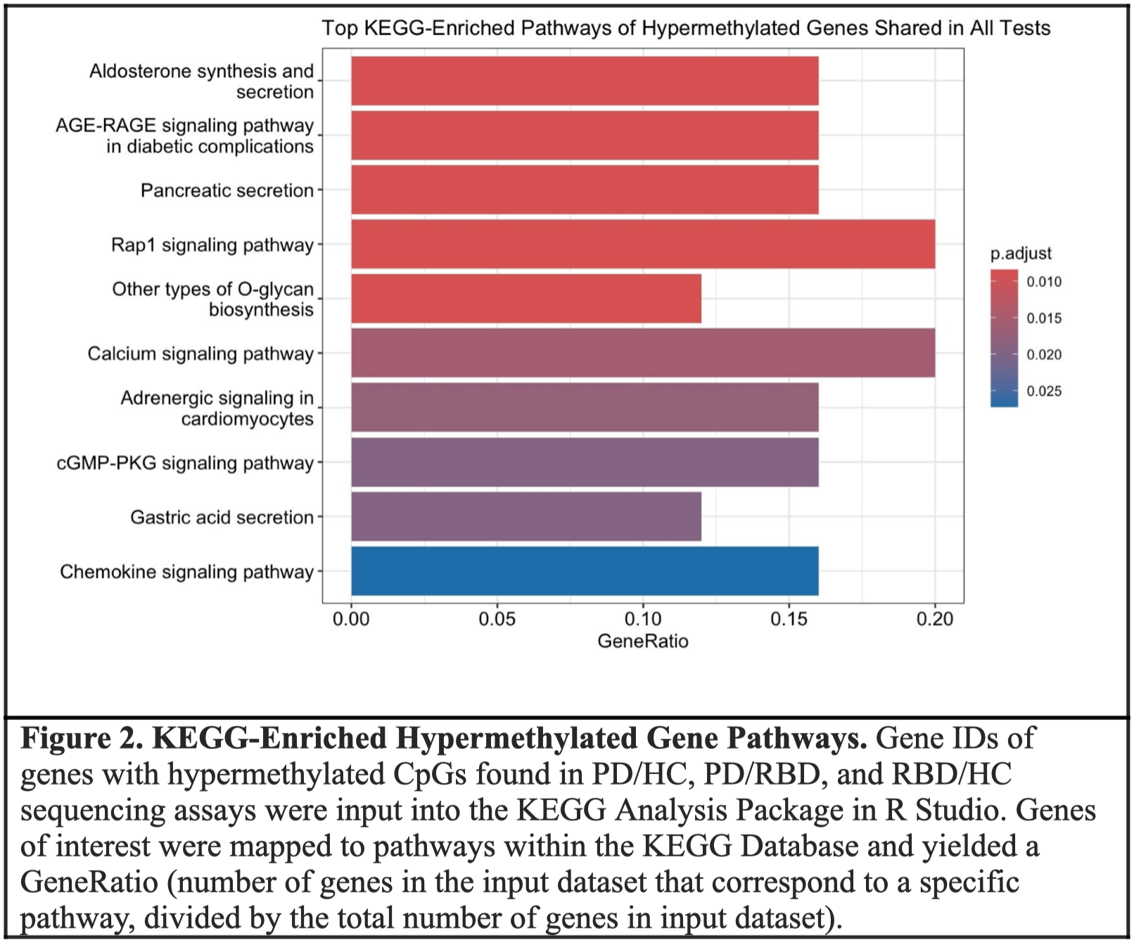 Results: PD cfDNA was found to have 893 DMP compared to HC, and 5324 DMP compared to RBD. RBD had 6862 DMP compared to HC. Of the 3462 unique hypomethylated genes implicated in these tests, 49 were found in all 3 tests (Figure 1A). Of the 3312 unique hypermethylated genes implicated in these tests, 51 were found in all 3 tests (Figure 1B). KEGG Enrichment revealed the functional pathways of the top 10 hypermethylated genes (Figure 2). Pathways that have been previously implicated in neurodegenerative disease pathogenesis were implicated, including aldosterone synthesis, part of the Renin-Angiotensin System, O-Glycan Biosynthesis, and calcium signaling [7,8,9]. No significant gene pathway enrichments were found in the 49 shared hypomethylated genes.