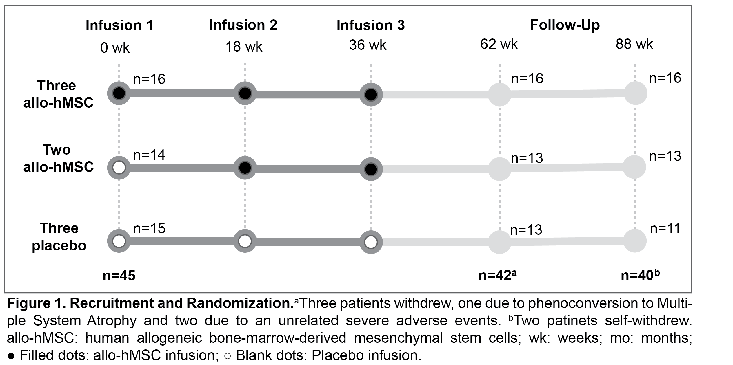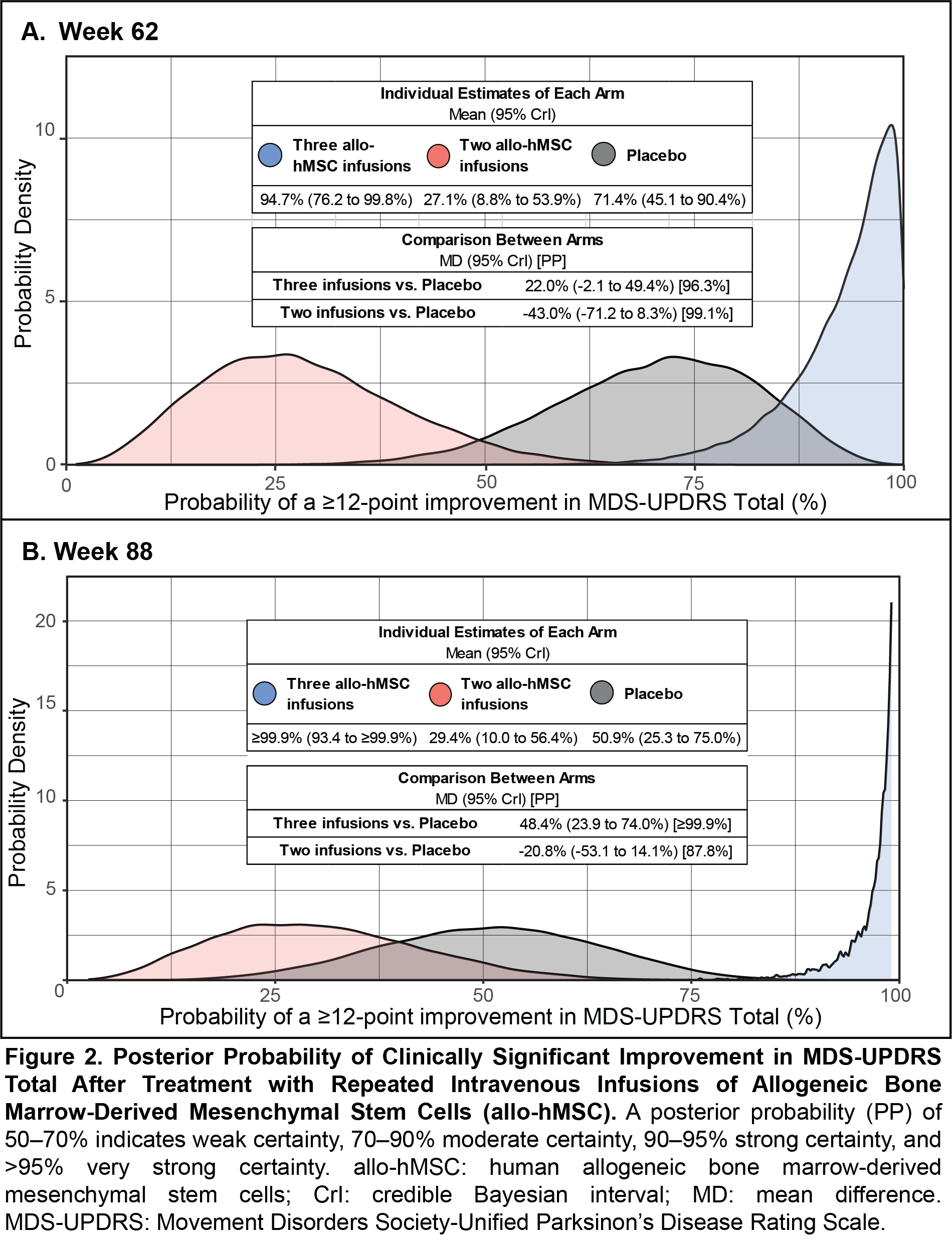 Results: 45 participants were enrolled, with 42 completing the week 62 follow-up and 40 completing the week 88 follow-up (figure 1). Demographic and clinical characteristics were similar between groups at baseline (table1). Patients receiving three allo-hMSC infusions demonstrated 96.3% probability of ≥12-point improvement on the MDS-UPDRS Total Score compared to placebo at week 62, and ≥99.9% probability at week 88. In contrast, patients receiving two allo-hMSC infusions failed to show improvement of ≥12 points on the MDS-UPDRS Total Score at either 62 or 88 weeks compared to placebo (figure2).