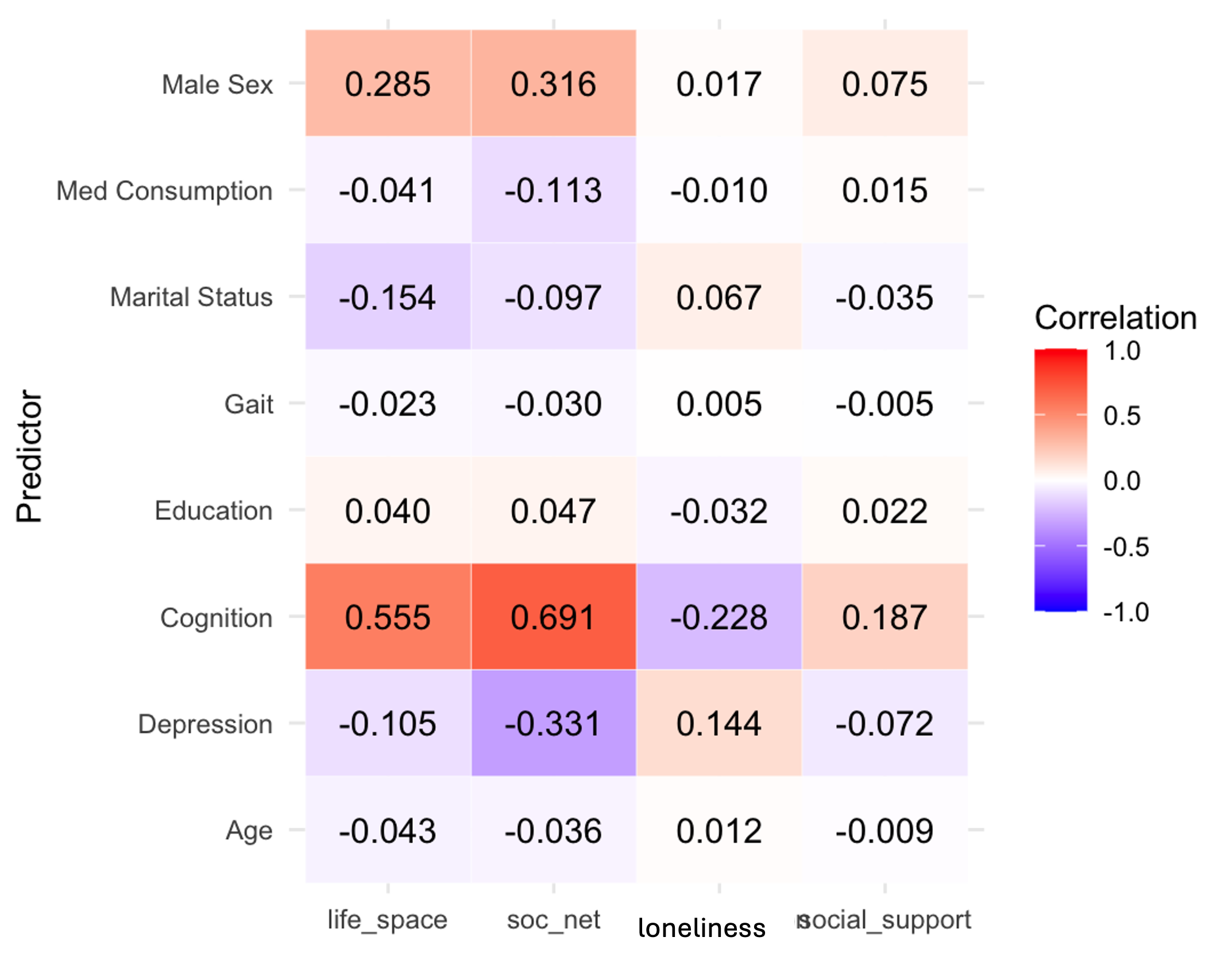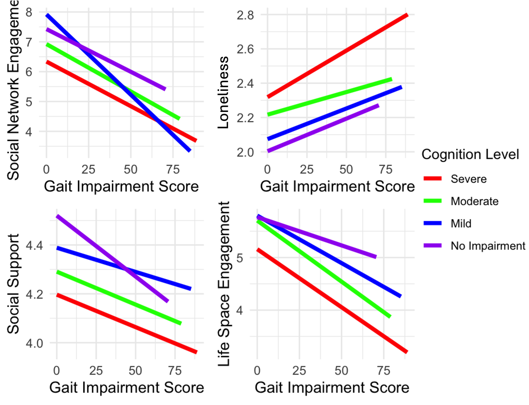 Conclusion: Cognition impacts social engagement and mobility. Our study showed that gait impairment restricted life-space mobility and increases loneliness, with the strongest effects in severe cognitive impairment. Preserved cognition buffered the impact, emphasizing the need for interventions targeting both. The moderate negative correlation between depression and social network size seen in the correlation matrix suggests that depression may contribute to social withdrawal. Future research should examine its role and the longitudinal trajectory of these relationships in shaping social engagement.