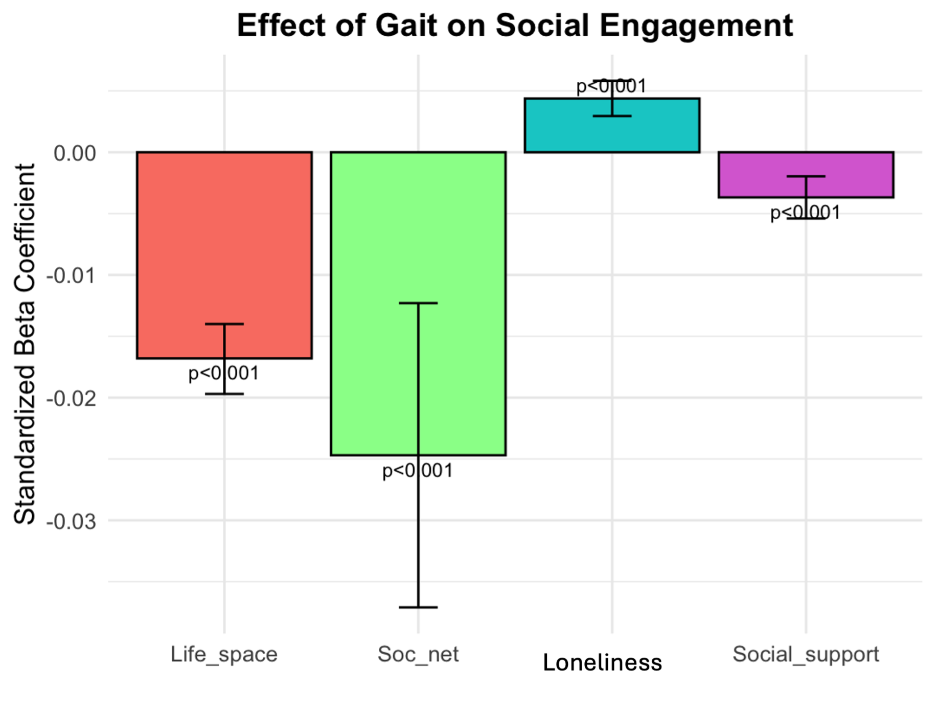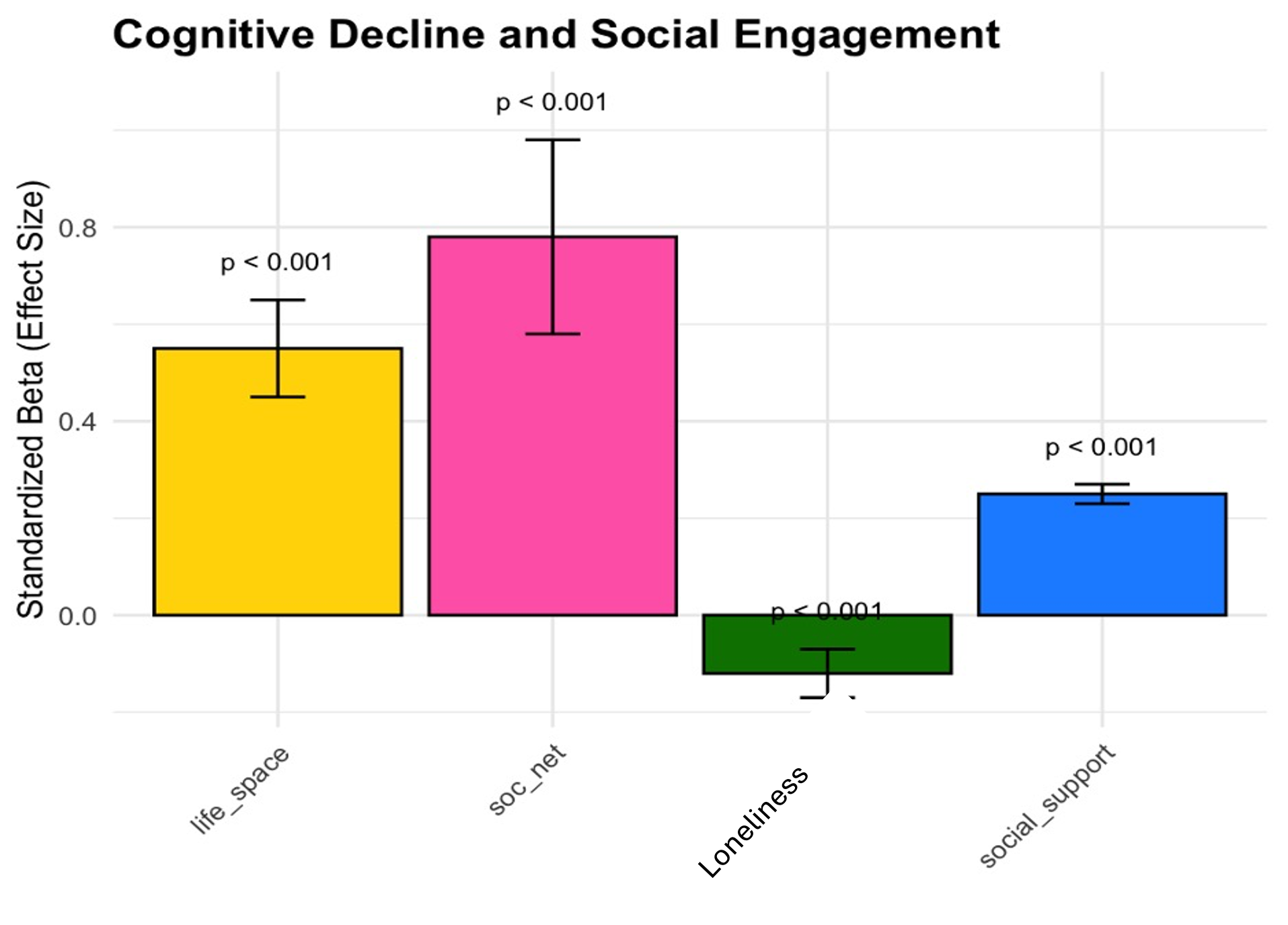 Results: The correlation heatmap revealed that higher depression was associated with greater loneliness (β = 0.14, p < 0.01)[Fig. 1]. Linear regression showed better cognition linked to greater mobility (β = 0.21, p < 0.01), while lower cognition was linked to increased loneliness (β = -0.15, p < 0.01) [Fig. 2]. Gait impairment was associated with reduced life-space mobility (β = -0.017, p < 0.01) and increased loneliness (β = 0.004, p < 0.01) [Fig. 3].  Multivariate regression models across cognitive quartiles, confirmed that gait impairment’s impact on social engagement was strongest in severe cognitive impairment, with life-space mobility most affected. Preserved cognition mitigated these effects [Fig. 4].