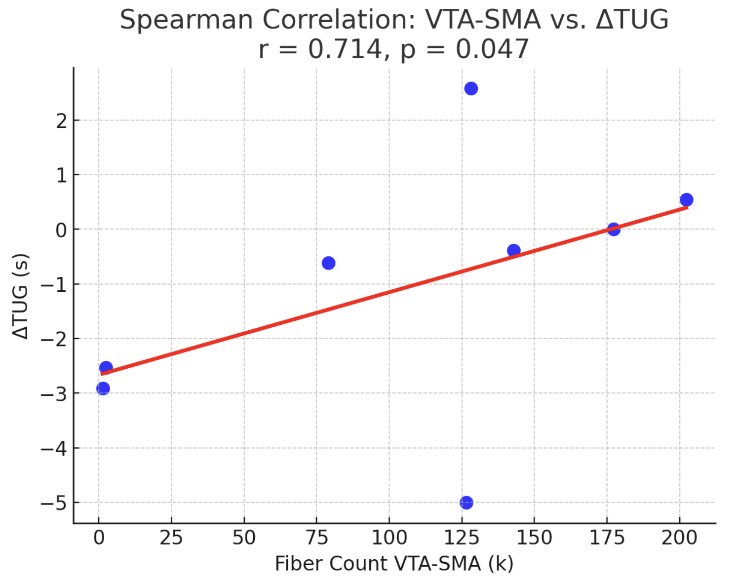 Results: A significant positive correlation was found between VTA-SMA connectivity and TUG improvement (r = 0.71, p = 0.047). A similar trend was observed between VTA-preSMA and TUG improvement (r = 0.67, p = 0.071), though it did not reach statistical significance. The correlation between VTA-preSMA and overall STS performance was weak (r = 0.14, p > 0.05).