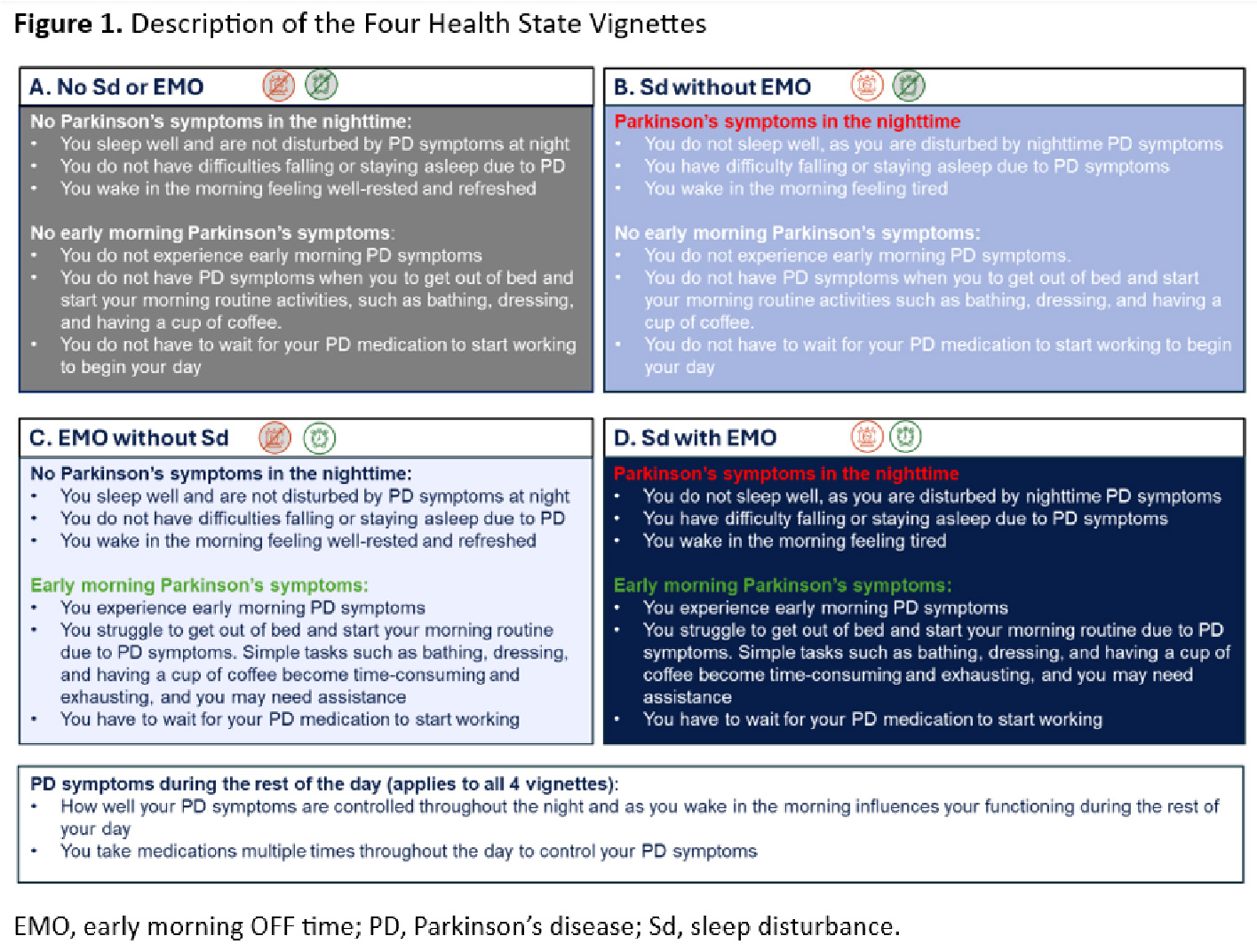Background: Parkinson’s Disease (PD) symptoms at night during sleep and in early morning become progressively more challenging to manage with oral medications as the disease advances. The impact of these symptoms on HRQoL, as measured by health-state utility values, has not been thoroughly quantified.