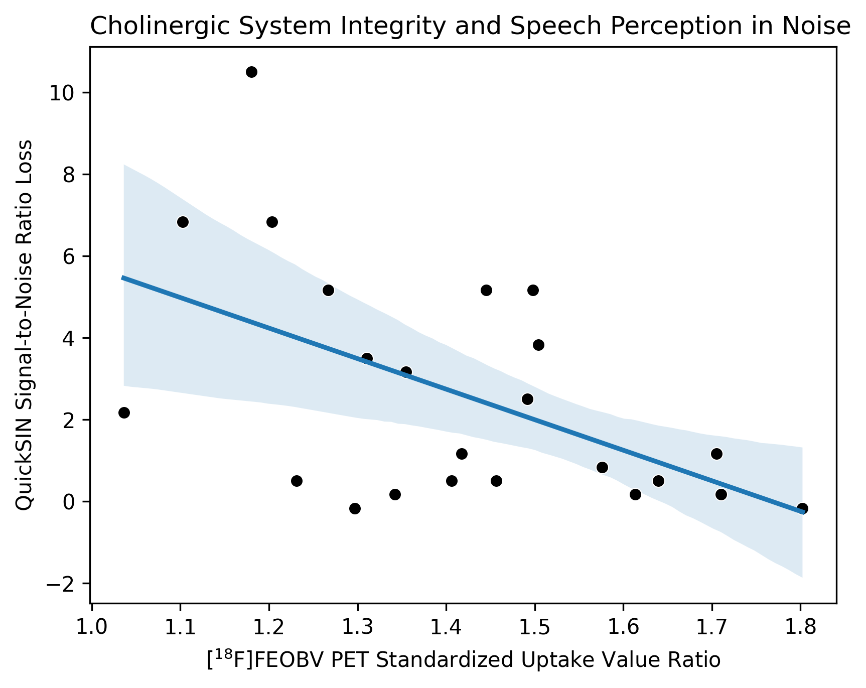 Results: Voxel-based analysis showed significant cholinergic vulnerability in right temporo-occipital junctions, right superior temporal and temporal operculum auditory cortices, right dorsolateral prefrontal cortex, right orbitofrontal, posterior & anterior cingulum, right superior parietal cortex, right inferior colliculus, right superior and posterior cerebellar hemisphere, superior vermis, retrosplenial cortex, right occipital cortex (cluster-level FWER corrected P<0.05, see figure 1). A mask of statistically significant voxels was used to extract the mean [18F]FEOBV uptake value for regression analyses. A post-hoc regression analysis showed that greater central cholinergic system integrity associated with better SPiN performance (see figure 2) independently of pure tone audiometry (β=-0.507, p=0.013), accounting for an additional 25.4% of the variance in SPiN.