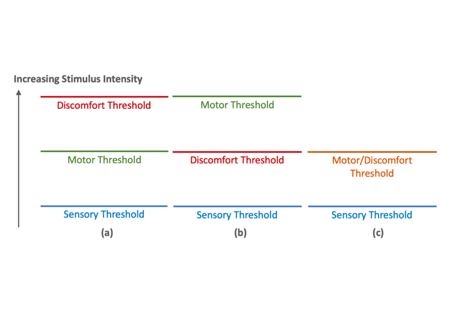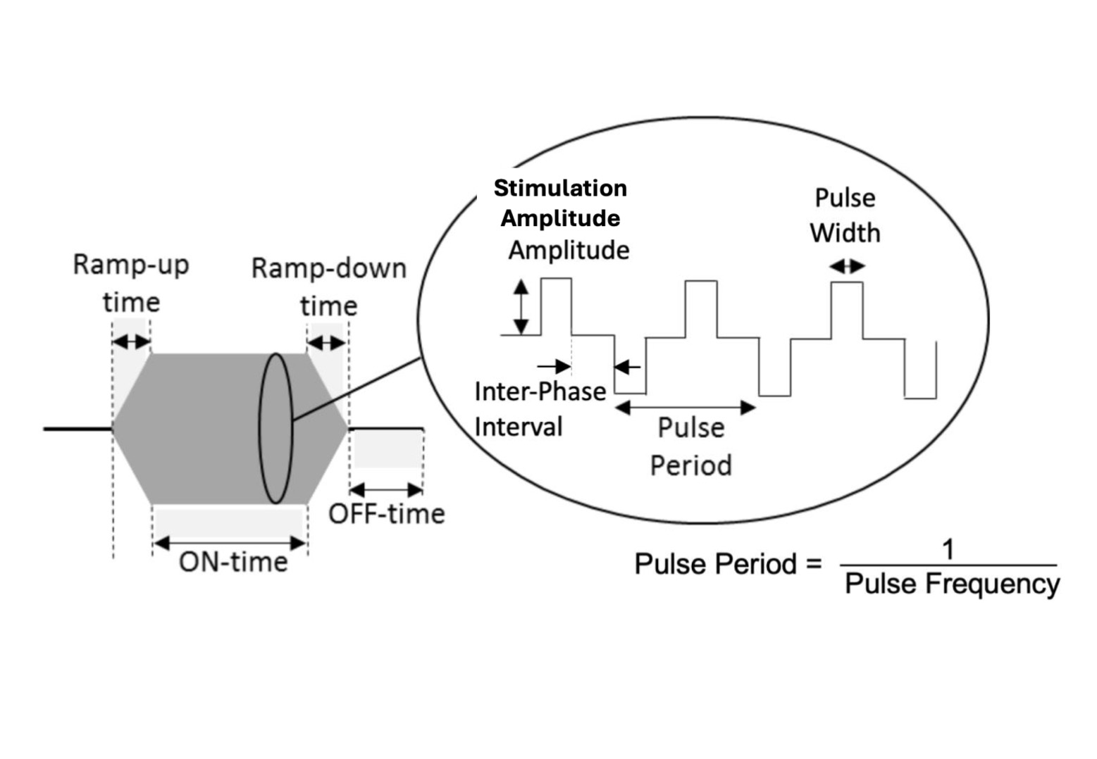 Method: A body-worn bilateral sensory electrical stimulation cueing system delivering cues to the anterior skin surface of the person’s left and right thighs in an alternating, rhythmic manner (Figures 1 & 2) was tested. The Stimulation Amplitude for each leg was set between the sensory and discomfort thresholds for that leg (Figures 3 & 4), and the cue rhythm was scaled to the patient’s un-cued stride rhythm. A patient with moderate FoG was tested using in-clinic FoG provocation tests under Baseline, Sham stimulation, and Active stimulation conditions when the patient was in both the ON and OFF states. The Percentage of Time in FoG (PTF) and Number of FoG episodes Occurring (NFO) were assessed using frame-by-frame video analysis by two blinded, independent expert raters. The mean values for both raters were used.