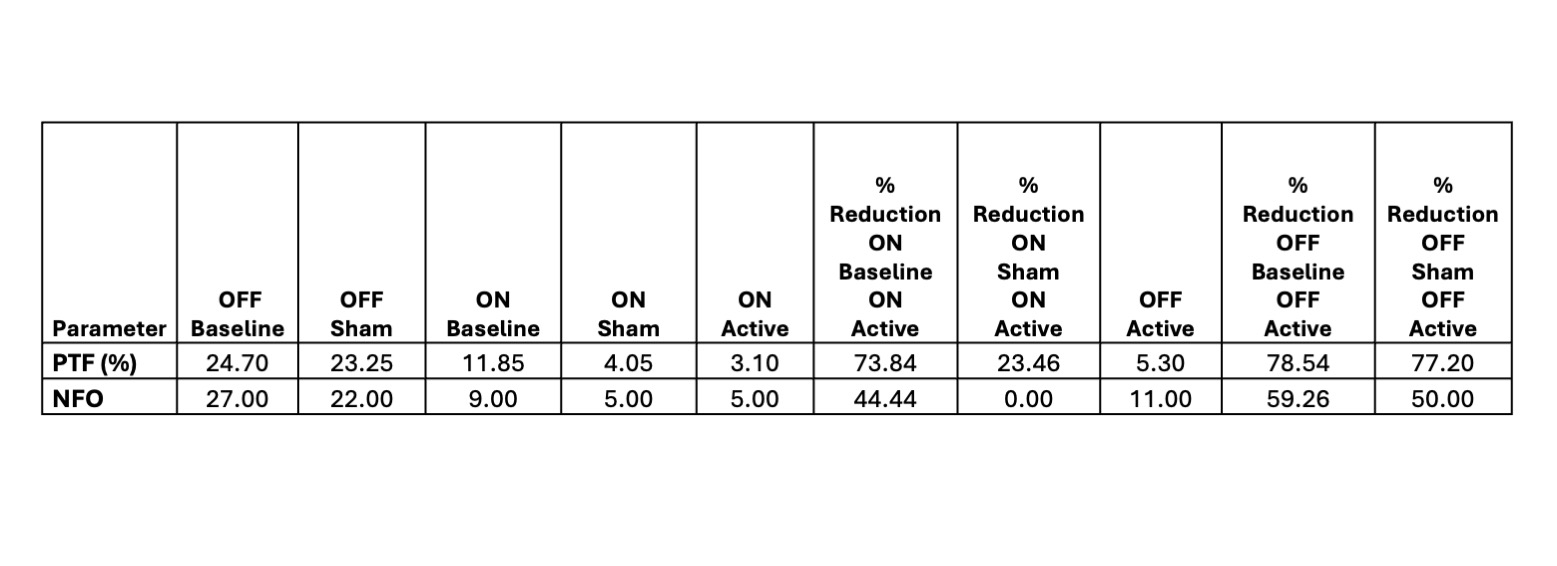 Results: The results are summarized in Table 1. In the OFF state, PTF was reduced from Baseline to Active by 78.54% and from Sham to Active by 77.2%. In the OFF state, NFO was reduced from Baseline to Active by 59.26% and from Sham to Active by 50.0%. In the ON-state, PTF was reduced from Baseline to Active by 73.84% and from Sham to Active by 23.46%. In the ON-state, NFO was reduced from Baseline to Active by 44.44% and from Sham to Active by 0.0%.