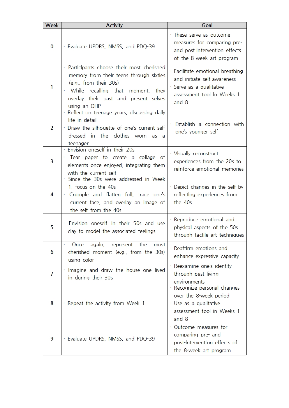 Results: Based on theoretical and clinical evidence, we propose an 8‑week art therapy protocol for Parkinson’s disease that integrates patients’ past and present through art and holistic breathing. Participants engage in weekly art tasks capturing life-stage-specific memories—with Week 1 overlaying past and present images via OHP and Weeks 2–7 using various media—and repeat Week 1 in Week 8 to assess qualitative change, with outcomes measured by the UPDRS and NMSS.