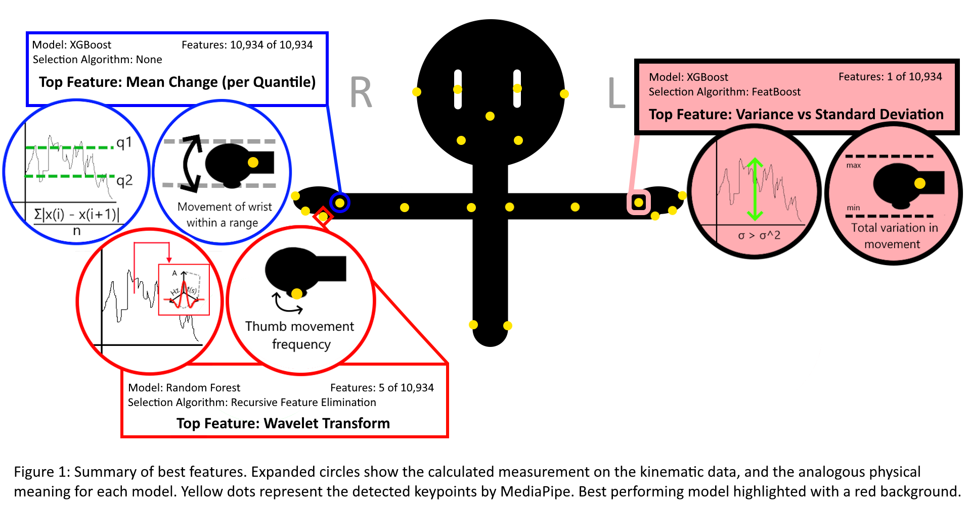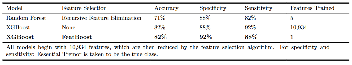 Conclusion: Our model using FeatBoost achieves high performance while maintaining interpretability, enabling objective measurements of ET and CM using non-invasive, accessible consumer video. Since this approach is data-driven, future work can explore larger datasets including more movement disorders.