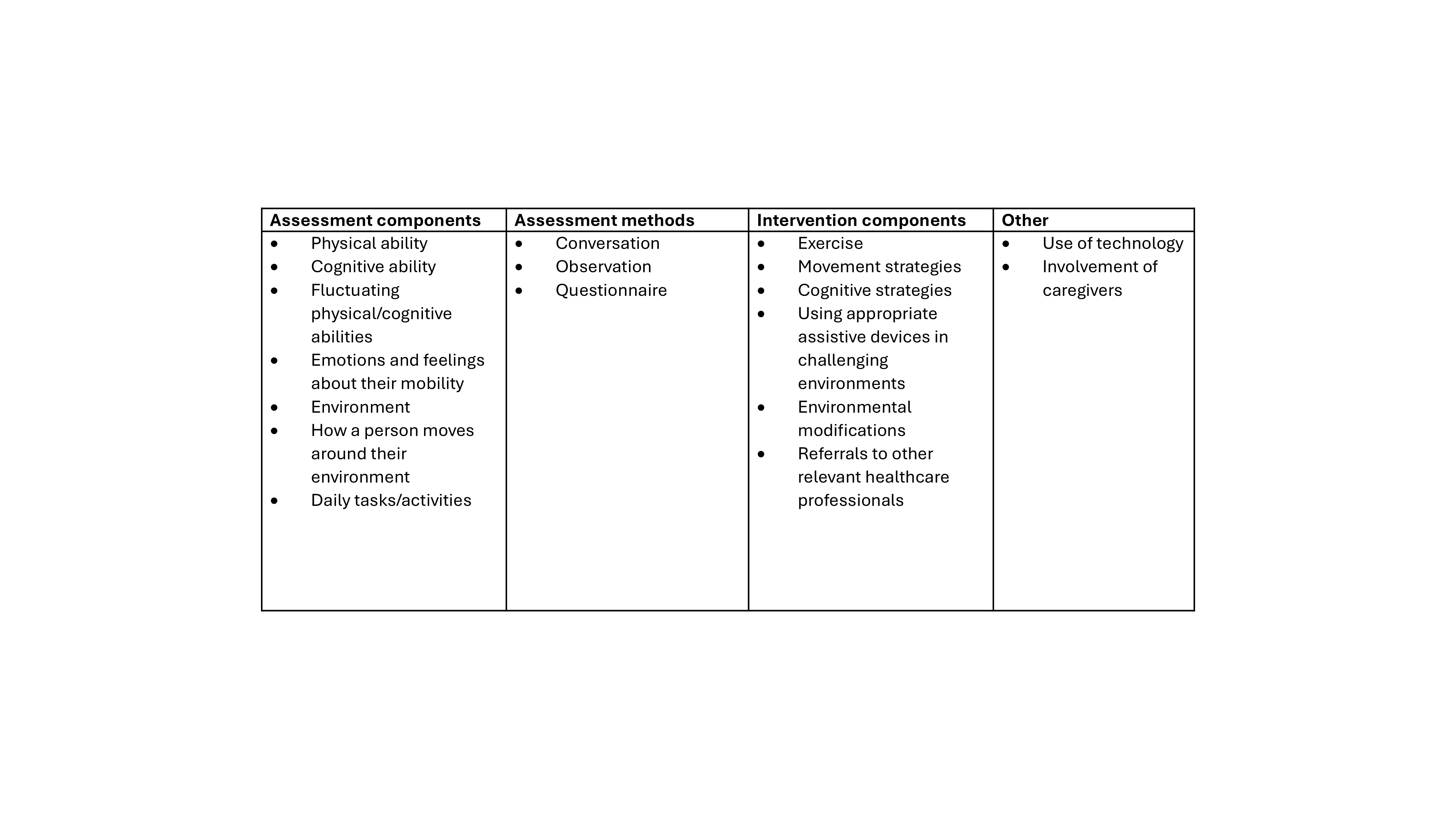 Results: A total of 60 lived experience and 43 clinician/researcher experts participated. Thirteen core components for assessment and intervention were identified along with three assessment methods and the involvement of caregivers and technology [Table 1]. After the final round, consensus was reached that all previously identified assessment and intervention components, along with caregiver involvement, were important to target safer mobility behaviour. No consensus was reached on the use of technology for assessment. The top two assessment components ranked by both panels was the consideration of physical and cognitive ability. The top three intervention components ranked by both panels was the inclusion of exercise, movement strategy training and cognitive strategy training.